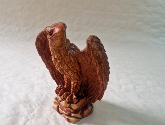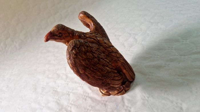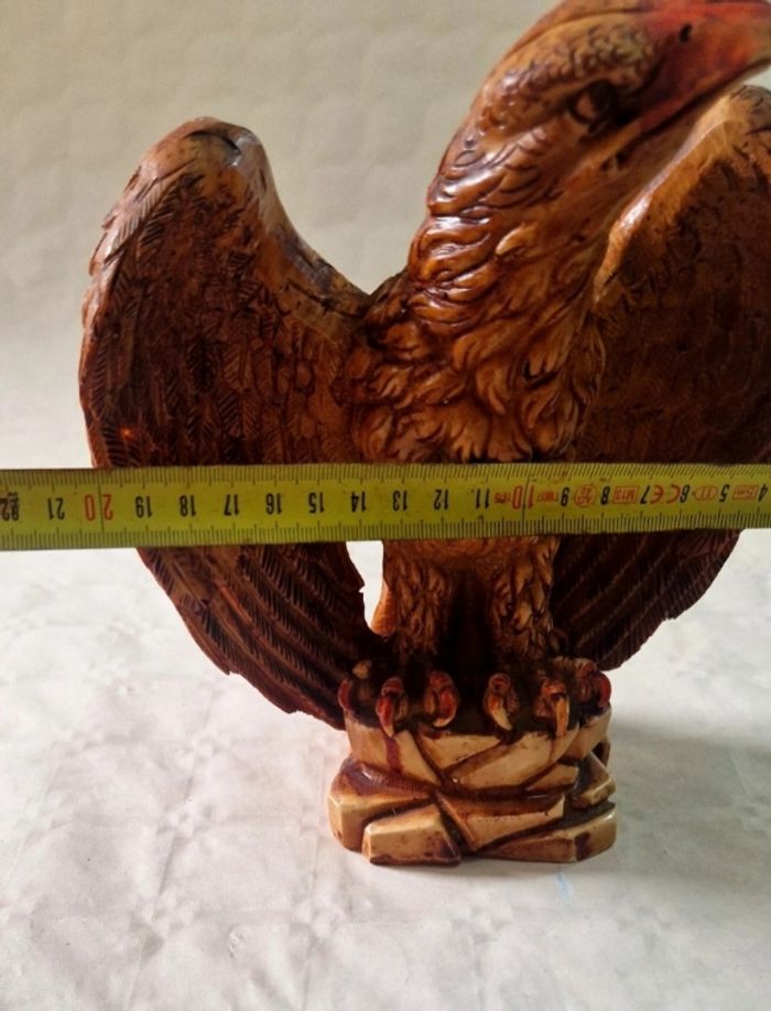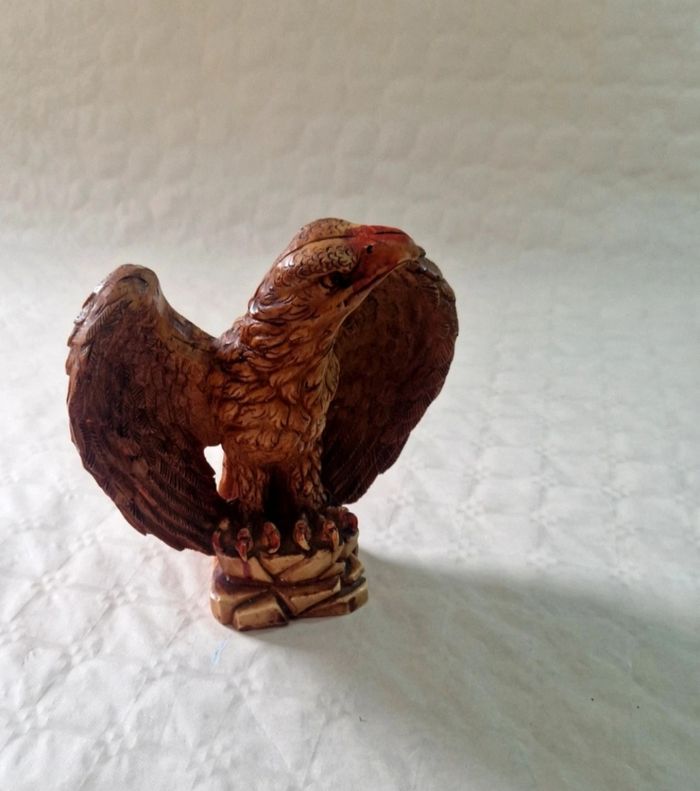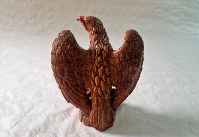 Bonjour. ​Statuette décorative représentant un aigle aux ailes déployées, posé sur un rocher. L'objet présente un aspect sculpté avec une finition imitation bois (matière type résine ou composite). ​Dimensions : Environ 21 cm de hauteur pour 19 cm d'envergure (visible sur photos avec mètre). ​Finition : Détails des plumes nervurés ​ #decoration #deco #aigle #statue #vintage #nature