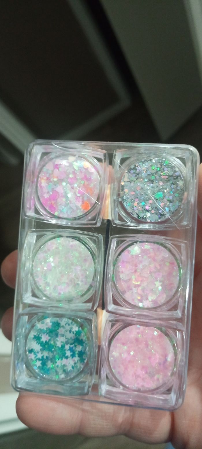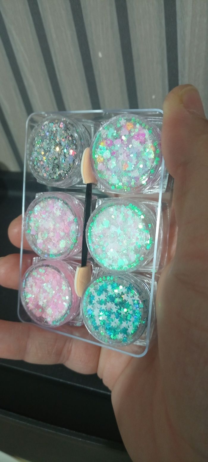 Je vends un Lot de 6 pots de paillettes multicolores. Utilisables pour les cheveux, le visage et les ongles. Pour Femme/fille Idéal pour maquillage festif, fêtes, anniversaires, loisirs créatifs. Différentes couleurs et formes (étoiles, reflets holographiques). État : neuf