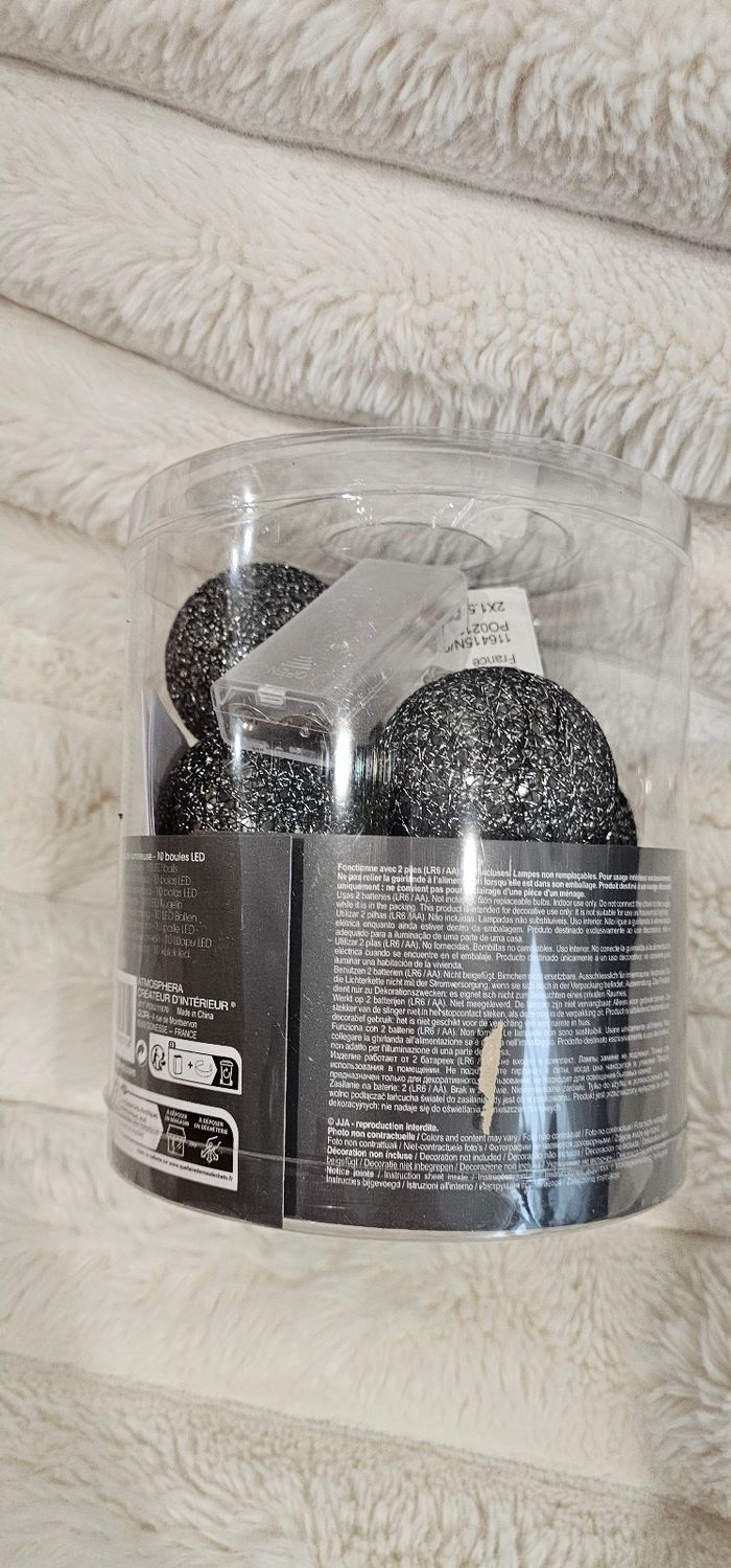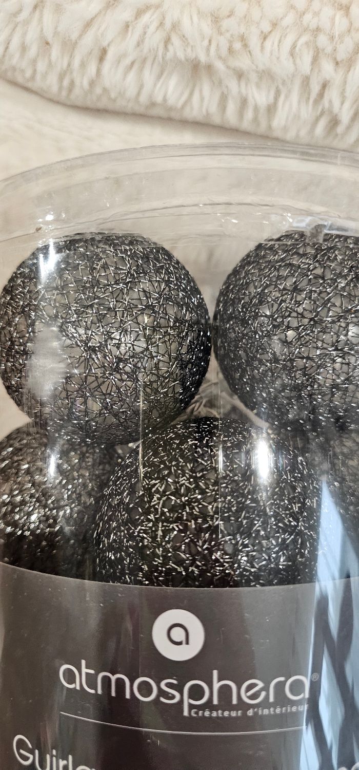 ☆ Guirlande lumineuse a led de 10 boules. ☆ Diamètre 6 cm. ☆ Couleurs noir & argenté. ☆ Fonctionne a piles 🔋 non fournies.