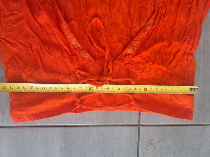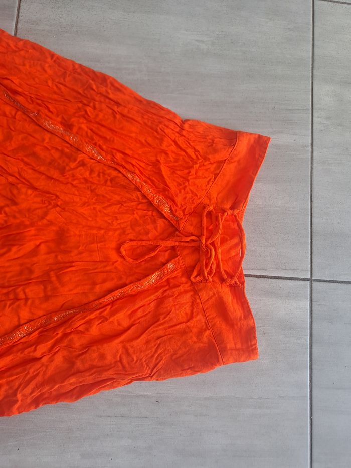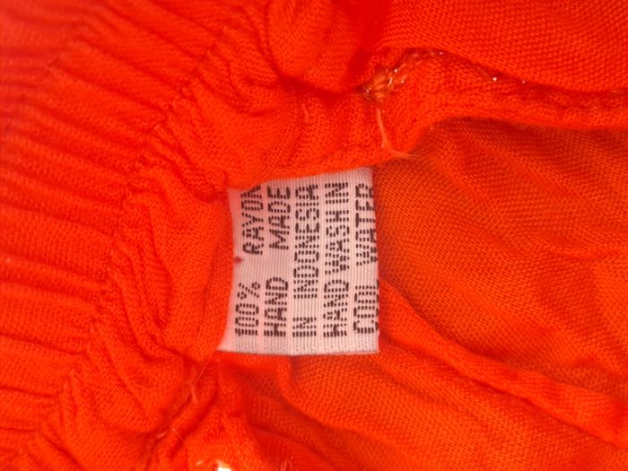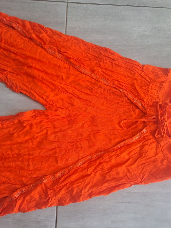 Pantalon original Ouvert aux jambes avec fentes sur les côtés Avec à l'avant avec un petit laçage Forme du pantalon un peu style sarouel Couleur orange / rouge Fait main en Indonésie Pas d'étiquette de taille (mesure en photo) , taille petit , taille Élastique Pas d'étiquette de marque