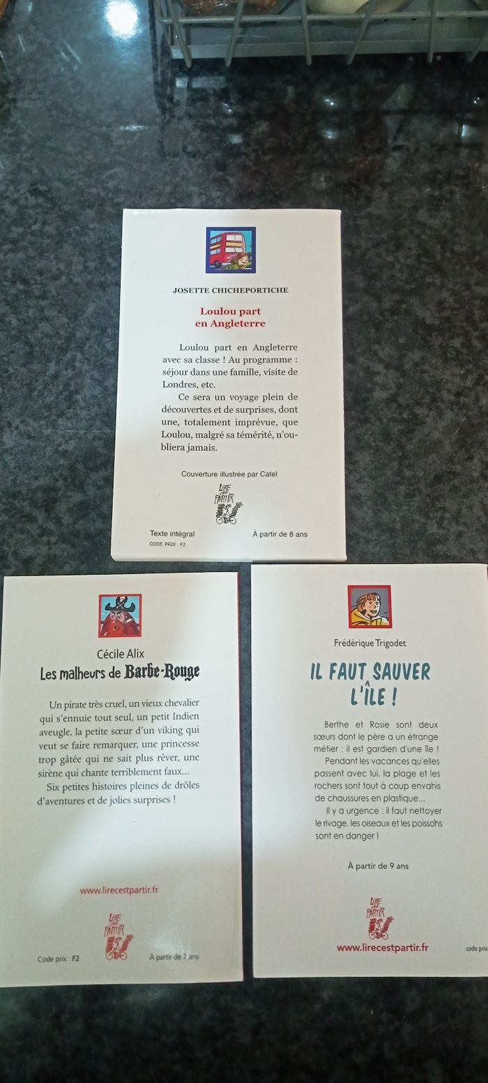 Je vends un lot de 3 livres de jeunesse - Loulou part en Angleterre – à partir de 8 ans - Les malheurs de Barbe-Rouge – à partir de 7 ans - Il faut sauver l’île ! – à partir de 9 ans ✔️ Livres propres et quasiment neuf ✔️ Pas de pages manquantes ✔️ Idéal pour enfants CE1, CE2, CM1 ✔️ Histoires d’aventure, humour et écologie Envoi rapide et soigné N’hésitez pas à me contacter pour toute question