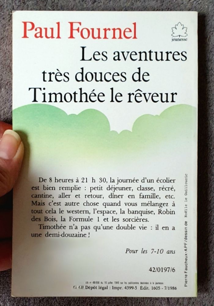 Résumé : De 8 heures à 21 heures 30, la journée d'un écolier est bien remplie : Petit déjeuner, classe, récré, cantine, aller et retour, dîner en famille, etc.. Mais c'est autre chose quand vous mélangez à tout cela le western, l'espace, la banquise, Robin des Bois, la Formule 1 et les sorcières.. Timothée n'a pas qu'une double vie : Il en a une demi-douzaine!.. Date de parution : 07/1986. Auteur : Paul Fournel. Illustrateurs : Noëlle le Guillouric & Pierre Faucheux - APF. Collection : Le Livre de Poche Jeunesse N°197. Éditions : Le Livre de Poche. =) 128 pages. En très bon état général! Juste de très légères traces d'usage sur couverture (minimes). L'intérieur du livre est nickel.