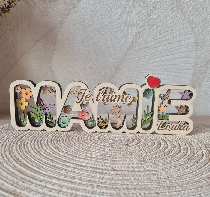 Support mamie, disponible en "je t'aime", "on t'aime", ou "je t'aime" plus 1 prénom. Couleur pastel ou vive.