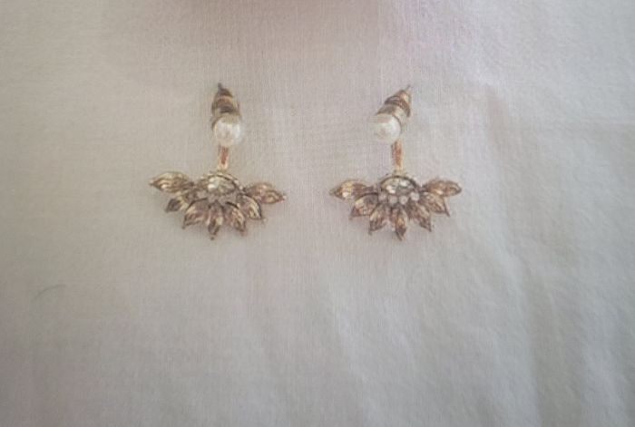 Boucles d'oreille métal doré perles blanches etcristaux verts et jaunes clairs Très mode Ravissantes
