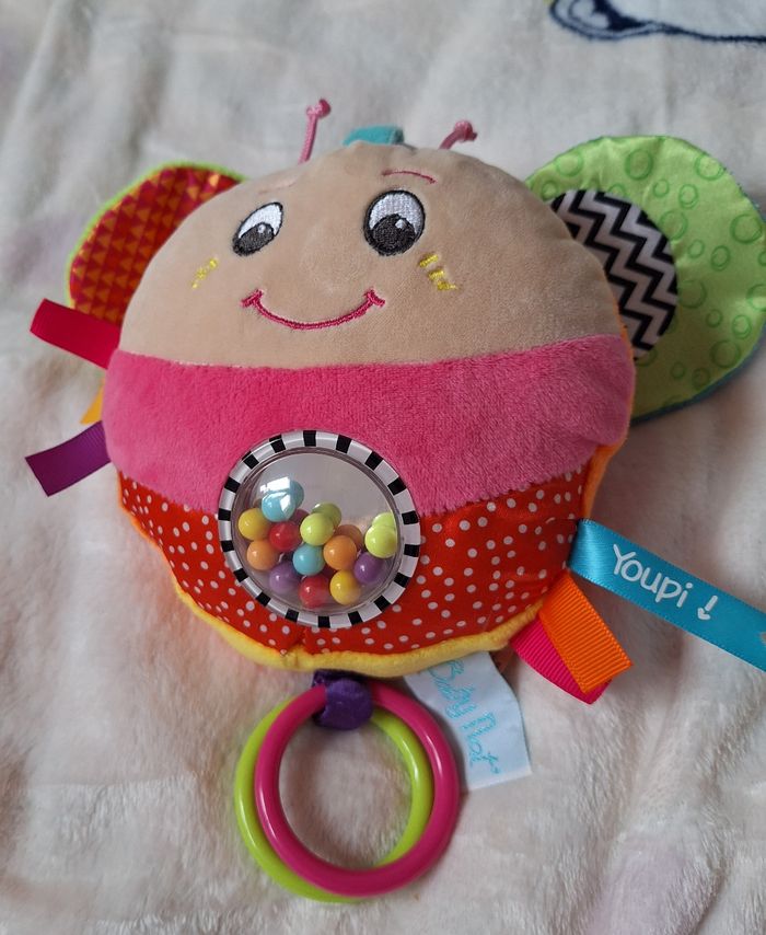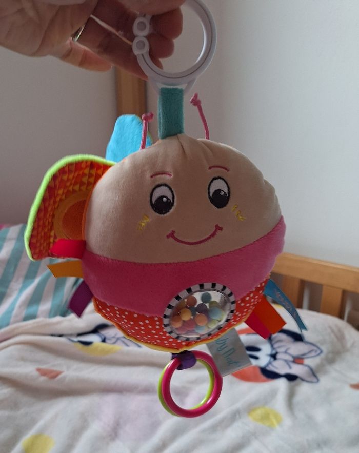 Léonie l'abeille vibrante aux différentes textures , étiquettes, imprimés et couleurs avec sa frimousse rigolote Lorsqu'on tire les 2 anneaux celà l'a fait vibrer et les billes multicolore bougent Miroir et papier froissé Jouet d'éveil peut se suspendre à la poussette ou autre grâce à son anneau Lavage en machine à 30°
