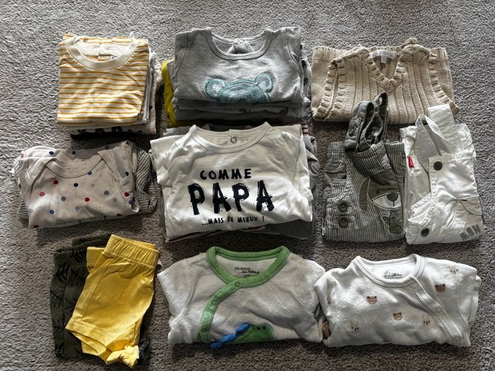 Lot bébé 3 mois comprenant: 7 t-shirt 6 bodies manches longues 3 bodies manches courtes 2 short 2 salopette été 4 pyjamas léger 2 pyjamas 2 pièces 1 combinaison polaire