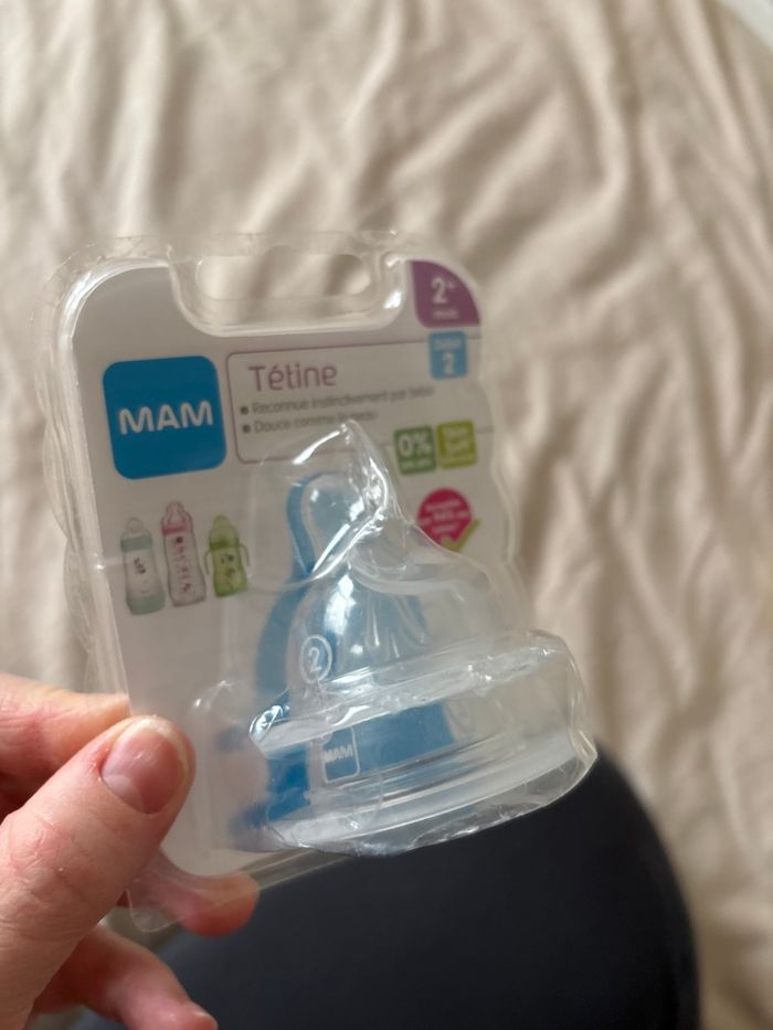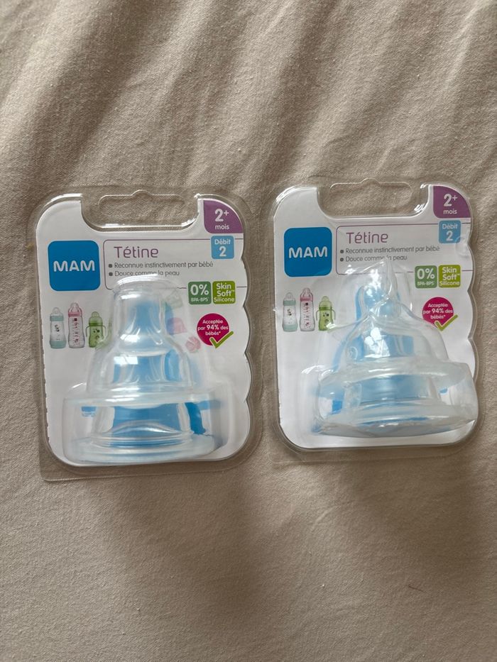 2 paquets de 2 tétines MAM débit 2, neuve, il y a un paquet qui est un peu abîmé mais il n’a jamais été ouvert