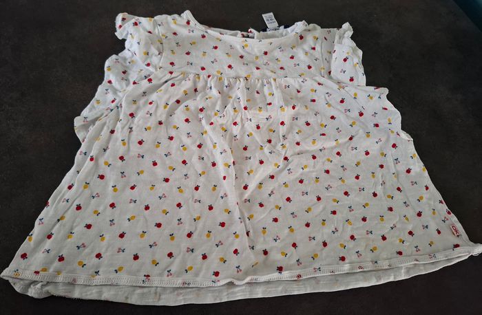✨ Très bon état 👶 Tee-shirt blanc avec petits motifs cerises / fruits rouges & jaunes 🌸 Manches courtes avec jolis volants aux épaules 🌿 Coupe fluide et confortable, parfait pour l’été 📏 Taille : 4 ans 🧵 Matière légère et agréable à porter 💡 Idéal avec un short, un legging ou une petite jupe pour un look trop mignon 🍓