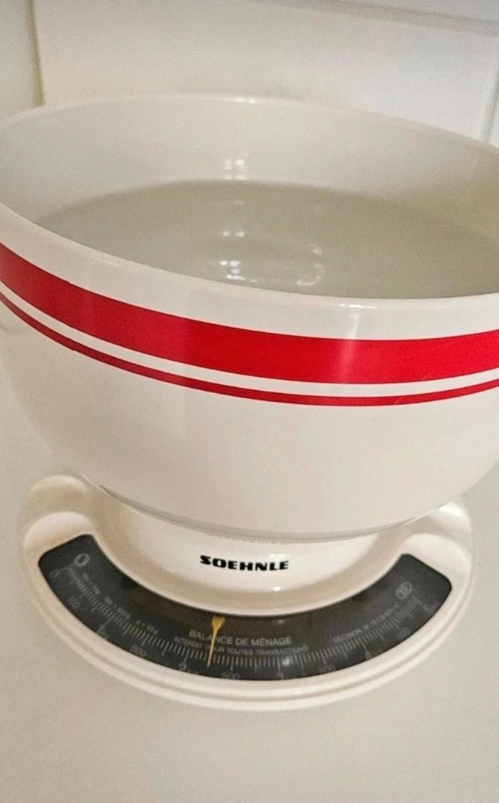 Balance + bol d'une contenance de 2,5L. Possibilité de tarer la balance. Très bon état