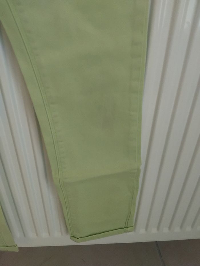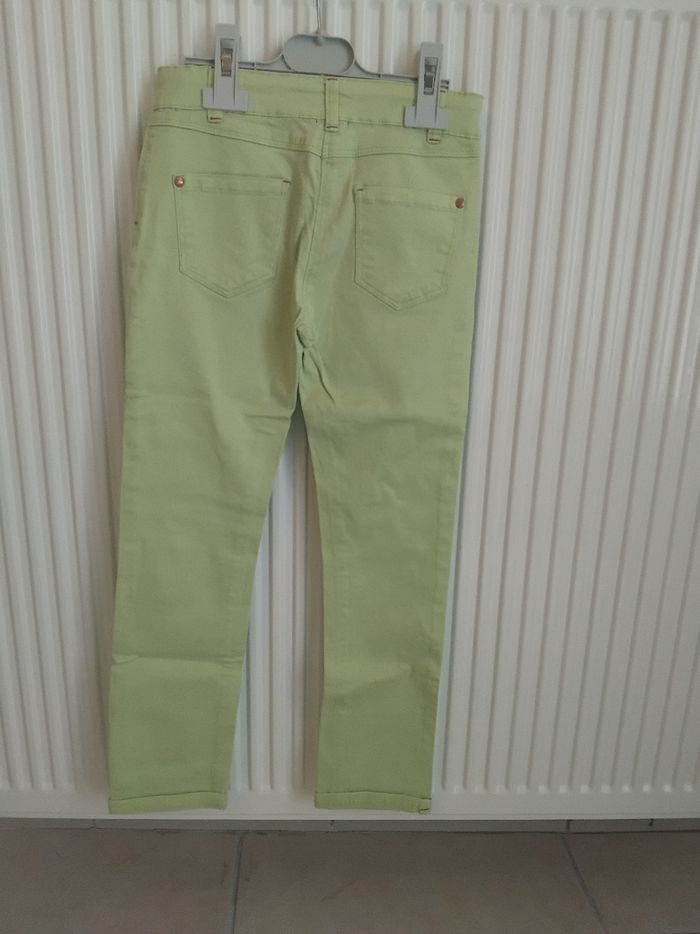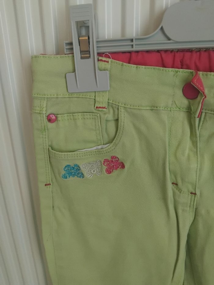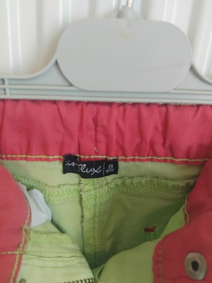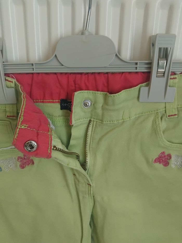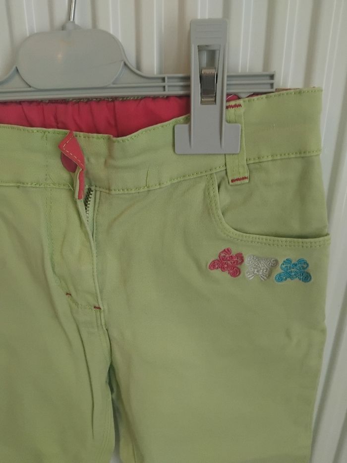 Pantalon de couleur vert anis. Marque influx, taille 8 ans. Comprenant deux poches devant de poche arrière et passant pour ceinture. Motif trois petits papillons au niveau des poches de devant. Ouverture pression et fermeture éclair élastique ajustable à la taille. Légère décoloration au niveau des genoux voir photos. Marque influx #fille8ansnade3033
