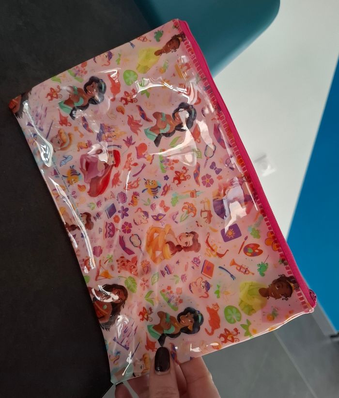 ✨ Très bon état 💗 Pochette / trousse plate transparente rose 👑 Motifs Princesses Disney (Belle, Ariel, Jasmine, Tiana…) 📚 Idéale pour école, maquillage ou rangement 🔒 Fermeture zippée rose Parfaite pour une petite fan Disney 💕