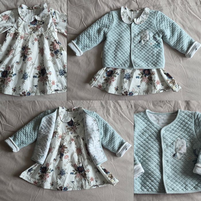​✨ ÉTAT : Porté une seule fois pour une photo, l'ensemble est comme neuf. Le blanc est resté bien éclatant, les couleurs fleuries sont impeccables et il n'y a aucune bouloche à déplorer. ​📏 TAILLE & COUPE : 12 mois (80 cm). ​Robe : Taille 1A sur l'étiquette. Coupe évasée très élégante avec col Claudine et finitions en dentelle délicate. Fermeture éclair invisible au dos pour un habillage facile. ​Veste : Modèle réversible avec boutons pressions, très pratique. Coupe confortable qui ne serre pas bébé. ​🌿 MATIÈRE : ​Robe : 100% Coton de haute qualité. Tissu léger, respirant et entièrement doublé pour un joli volume. Magnifique imprimé floral vintage. ​Veste : Mélange Coton et Polyester pour le côté matelassé vert eau. Doublure jersey très douce (95% Coton / 5% Élasthanne) avec rayures et motifs oiseaux. ​📦 LIVRAISON : Envoi via Mondial Relay (lockers), Shop2Shop ou Chronopost (point relais physique). ​🎁 Réductions sur les lots activées ! C'est le moment idéal pour compléter votre trousseau de naissance avec des pièces de qualité.