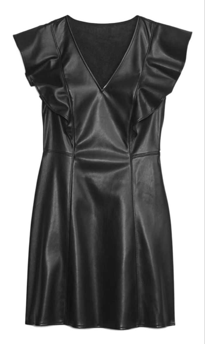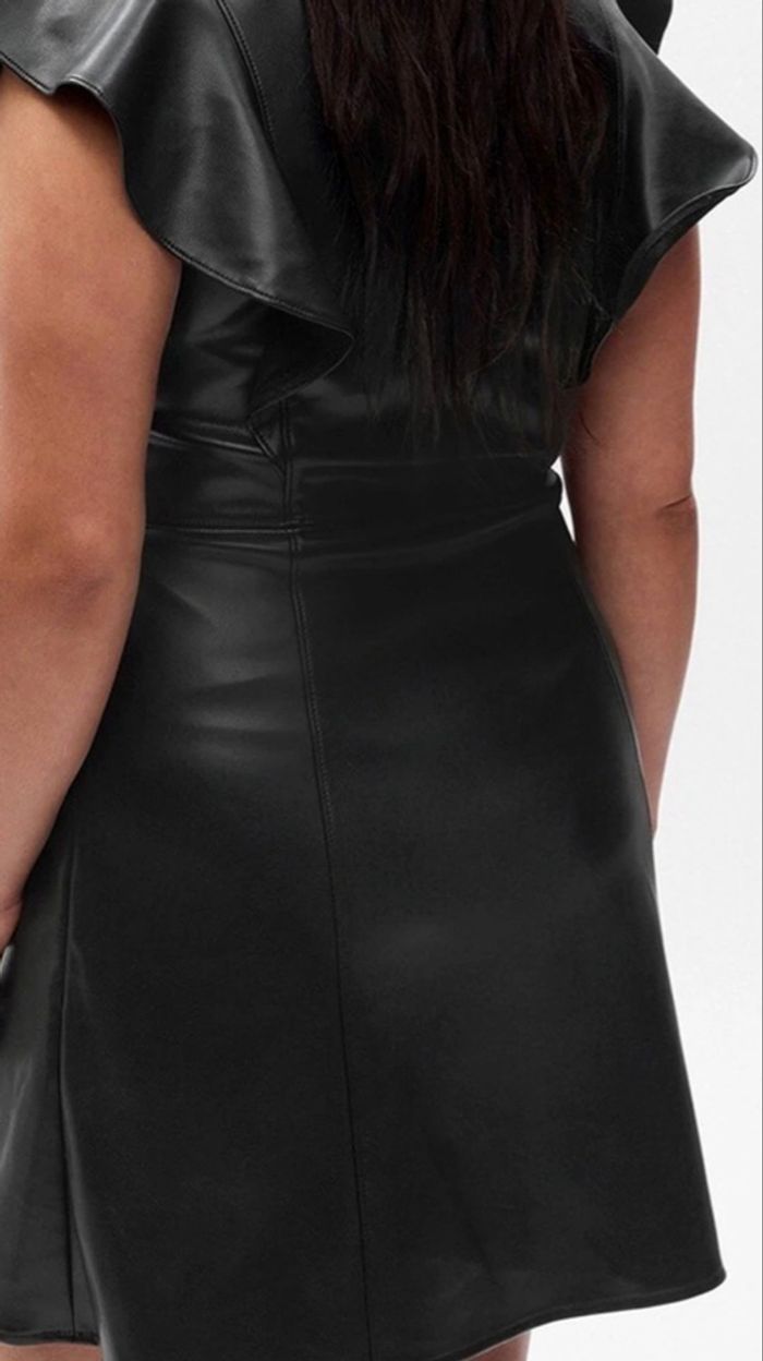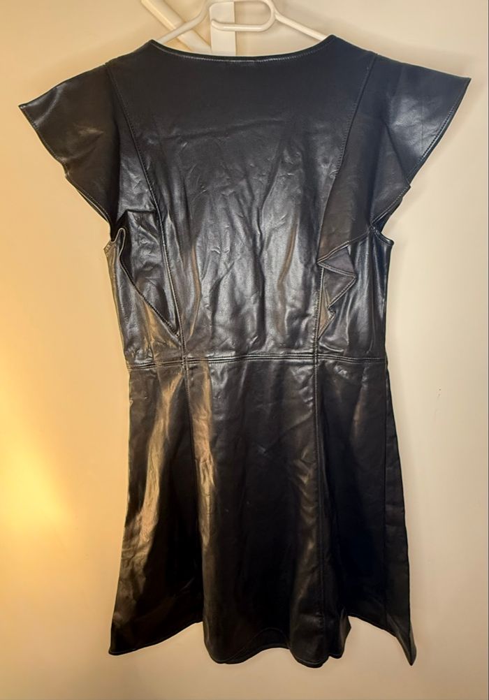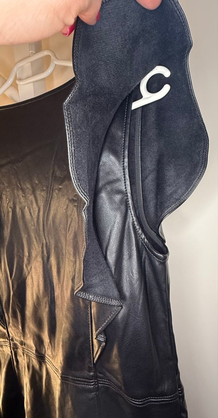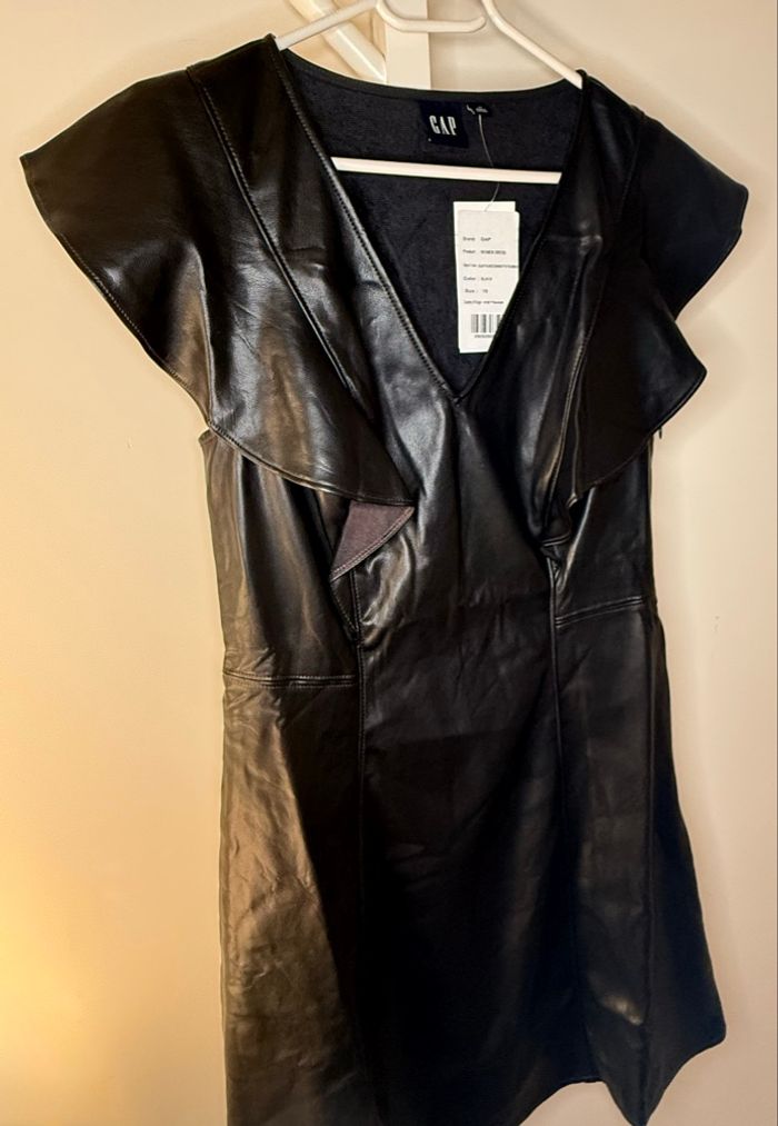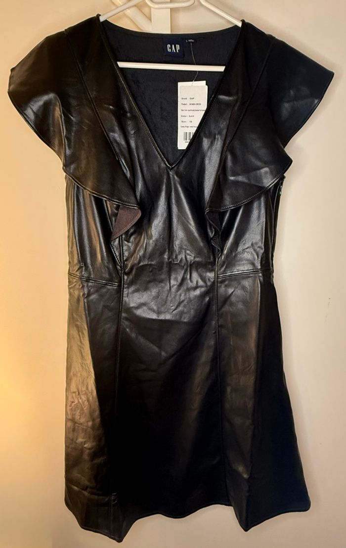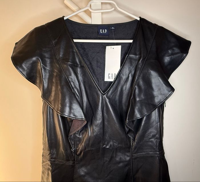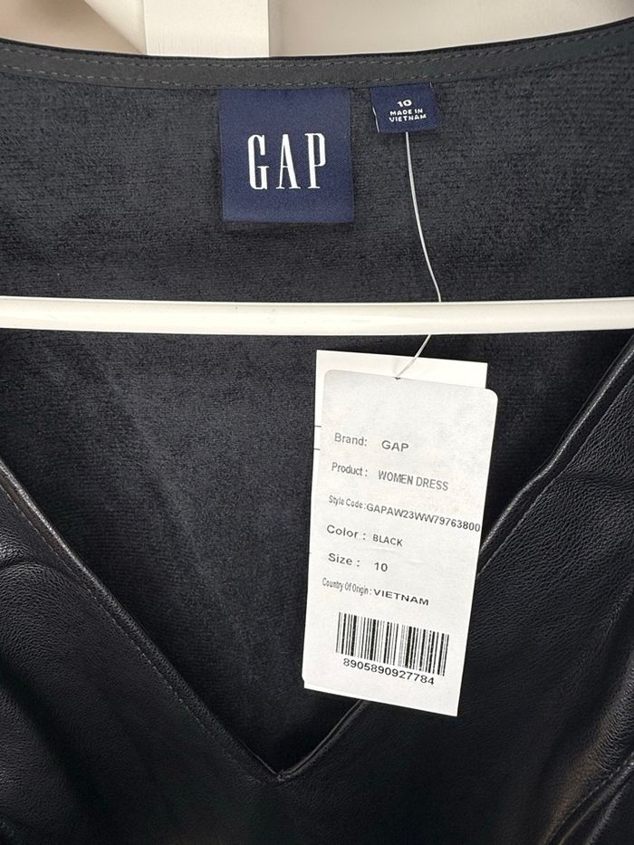 Robe trapèze noire avec col en V et sans manches de la marque GAP, taille 42. Effet cuir. Matière : 100% polyester