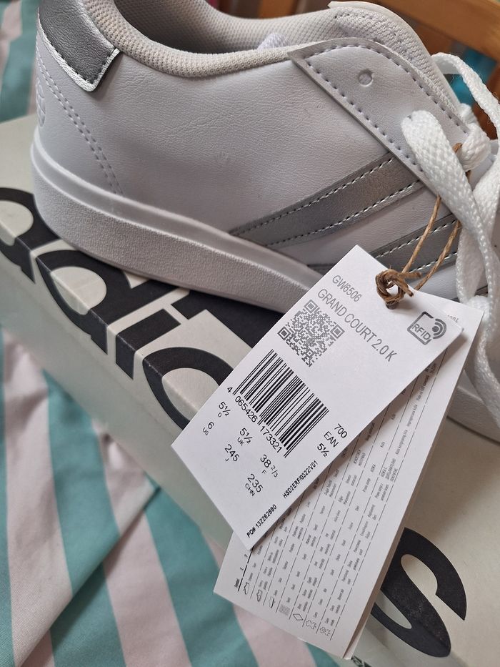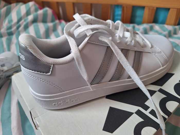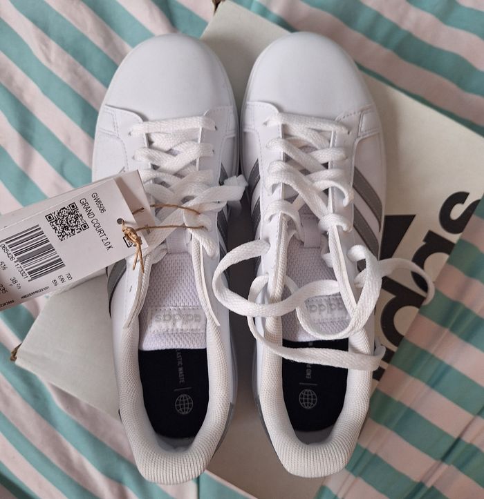 Basket adidas Grand Court en cuir synthétique, en version argentée ; trois bandes métallisées sur le côté extérieur, et trois bandes perforées sur le côté intérieur. Le logo adidas s’inscrit sur la languette, le contrefort, et la semelle. Tige stylée en matière synthétique 3 bandes perforées d'un côté et 3 bandes cousues de l'autre Type de fermeture: Lacets Marque: ADIDAS Genre: Femme Couleur: BLANC Motifs: Uni Tige: Synthétique Pointure. : 38.5 Photos supplémentaires sur demande si besoin