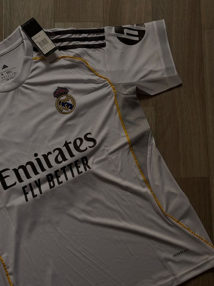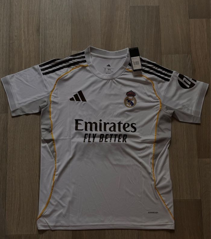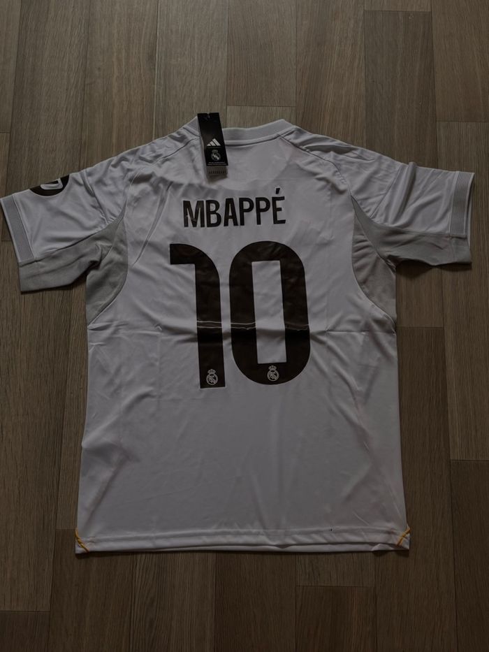 Maillot du Réal Madrid saison 2025/2026, floqué Kylian Mbappé dans le dos. * État : neuf avec étiquette * Taille : M * Flocage Liga Envoi rapide et soigné✅ N’hésitez pas en cas de questions