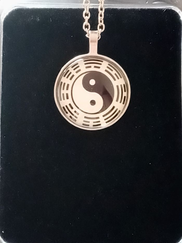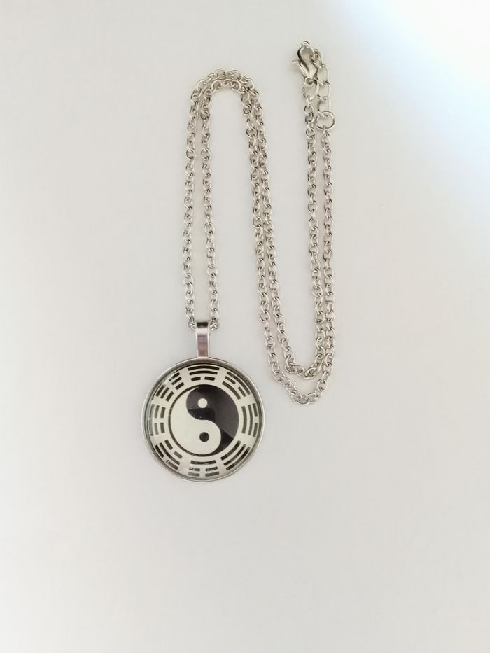 Chaîne + pendentif spirituel. Motif : yin-yang, pendentif en verre cabochon. (spirituel, protection, chinois, idéal cadeau) DESCRIPTIF : Couleur : argenté, blanc, noir. Taille chaîne : 45 cm Diamètre pendentif : 2.5 cm L * 3.5 cm H Envoi rapide et soigné.