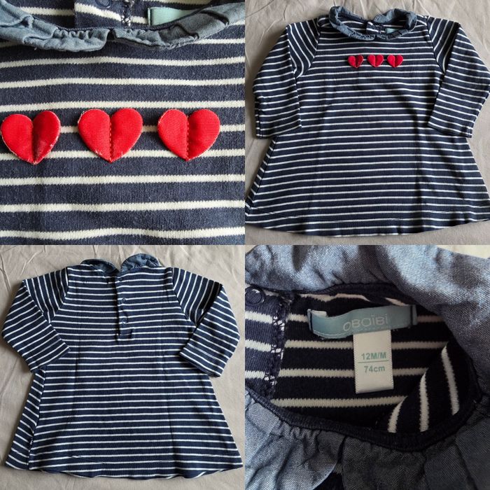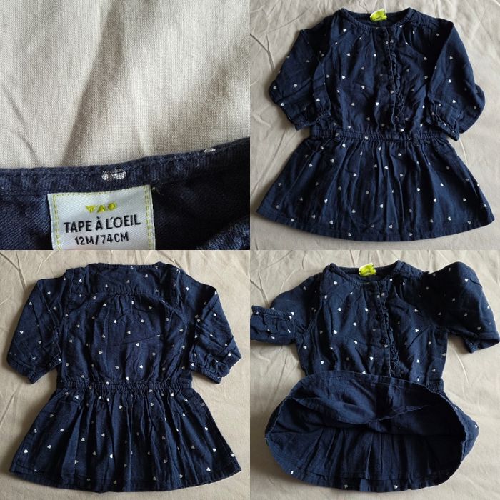 ​✨ ÉTAT : Très bon état général. Les couleurs sont bien préservées, les tissus sont restés souples et les détails (cœurs argentés et rouges) sont impeccables. ​📏 TAILLE & COUPE : 12 mois (74 cm). Le lot comprend : ​1 robe Petit Bateau en molleton rayé gris et marine. ​1 robe Tape à l'œil bleue avec petits cœurs argentés et taille élastiquée. ​1 robe Okaïdi (Obaïbi) rayée marine et blanc avec 3 cœurs rouges en relief et col chemise. ​🌿 MATIÈRE : 100% Coton. Des matières douces, confortables et respirantes, parfaites pour le quotidien de bébé. ​📦 LIVRAISON : Envoi via Mondial Relay (lockers), Shop2Shop ou Chronopost (point relais physique). ​🎁 Réductions sur les lots activées ! C'est le moment de craquer pour plusieurs articles et d'économiser sur les frais de port.