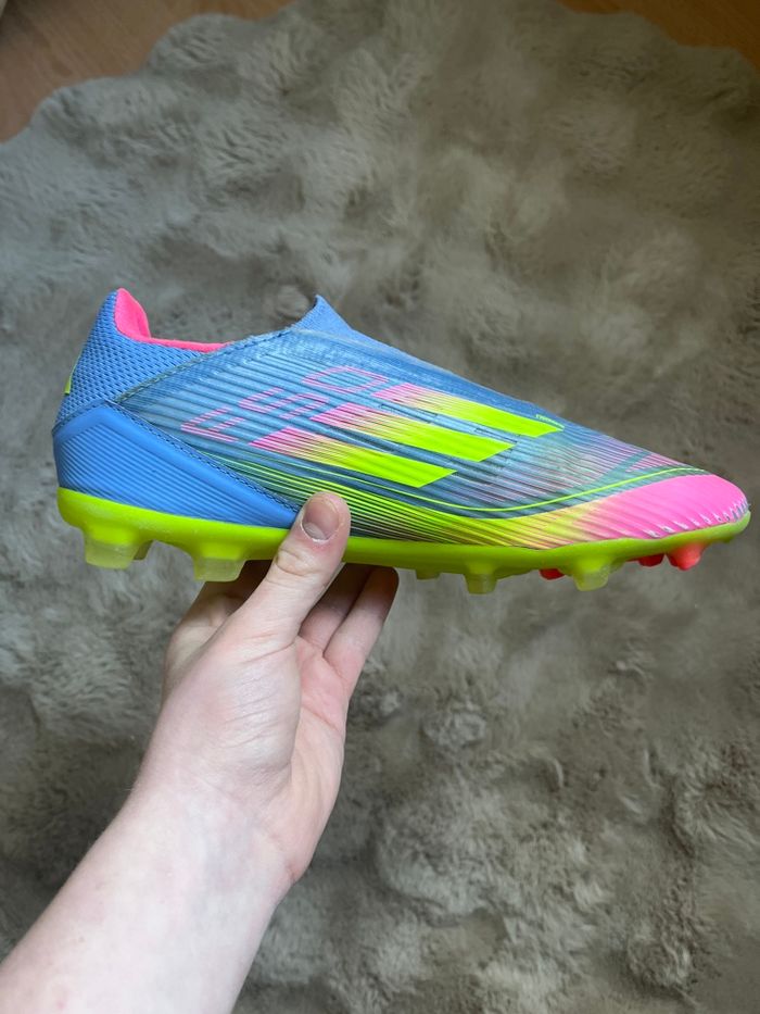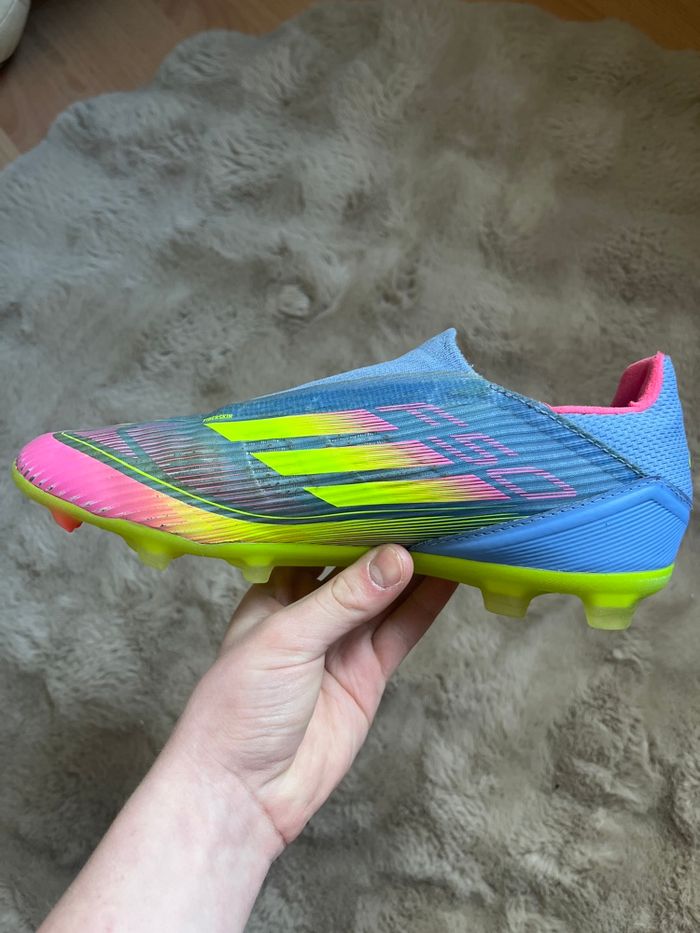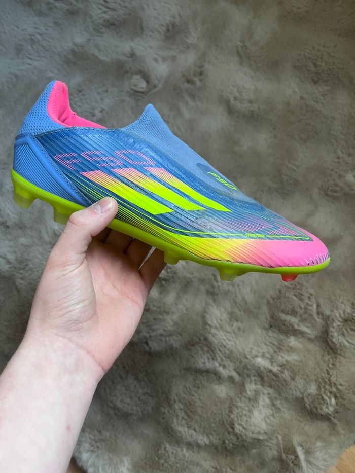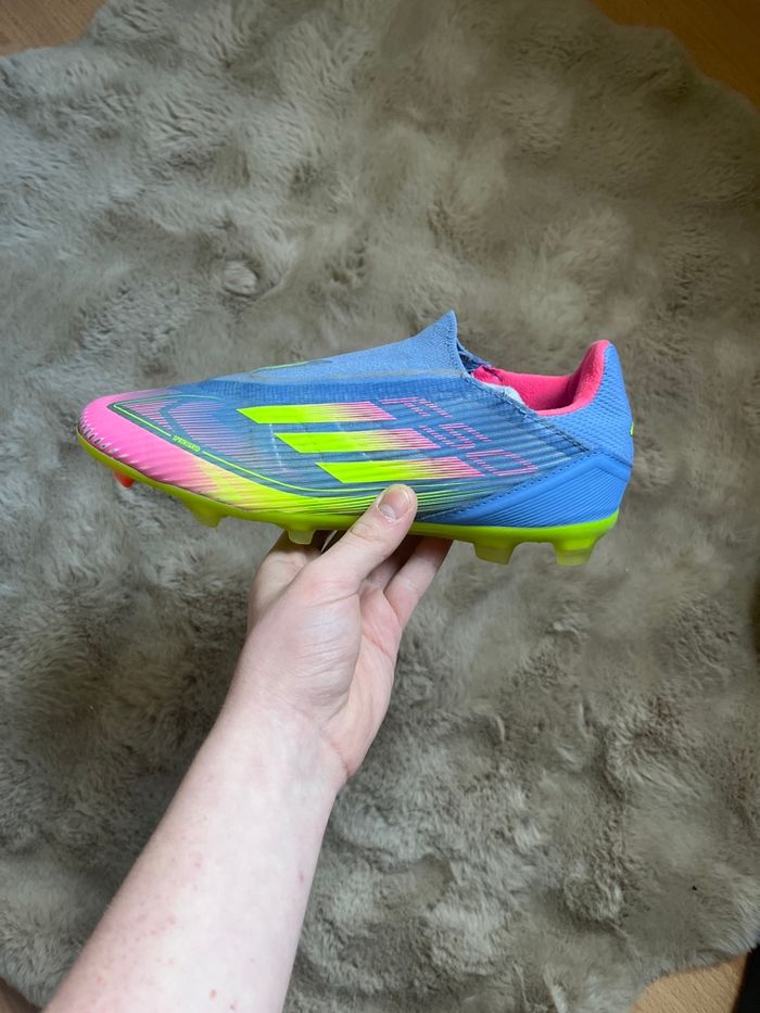 Paire de baskets Adidas multicolores (bleu, violet, vert et rose) en taille 40. Modèle confortable et original, idéal pour un usage quotidien ou pour compléter un look sportif et coloré. État général correct : les chaussures restent agréables à porter malgré quelques petits défauts. À noter un petit trou dans la semelle de la chaussure gauche ainsi que de légers trous au niveau des languettes. Ces imperfections n’empêchent pas l’utilisation mais sont prises en compte dans le prix. Prix : 40 €. Photos supplémentaires possibles sur demande.