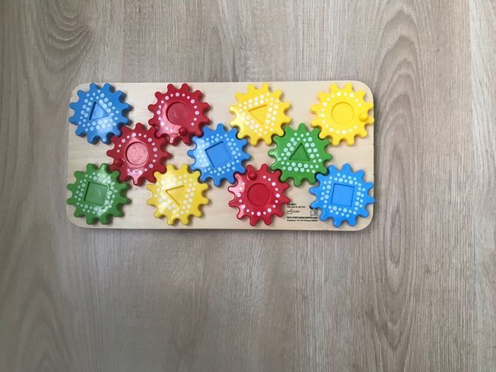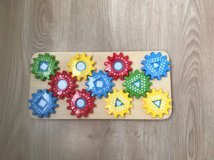 Jeu engrenages Playtive Junior Jeu en bois avec un plateau pour les formes et 1 plateau pour les couleurs. A partir de 3 ans.