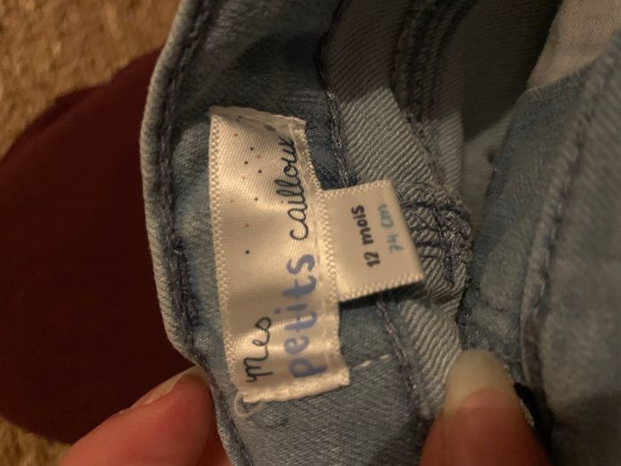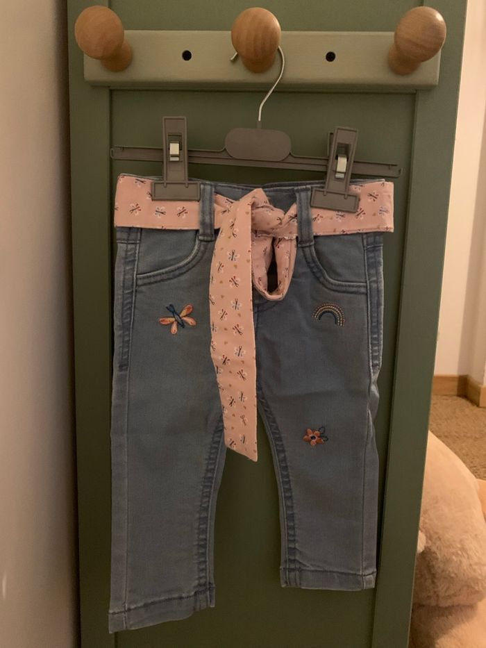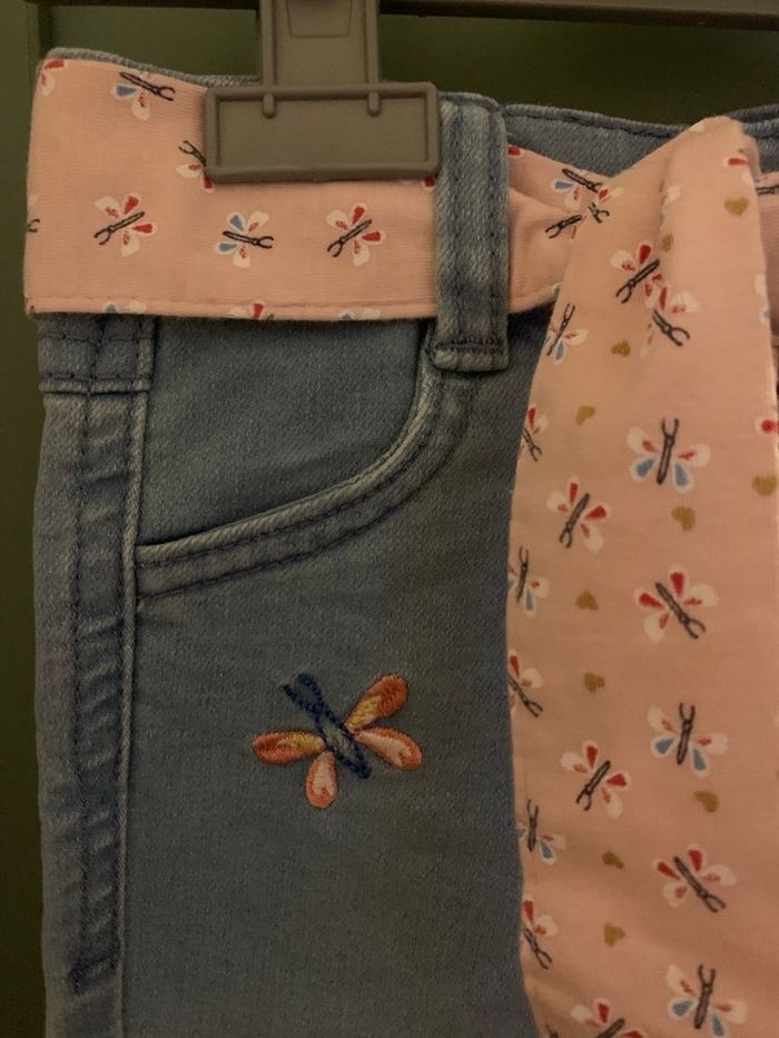 Joli jeans avec des motifs brodés et un bandeau rose. Taille: 12 mois - 74cm Marque: mes petits cailloux Peu porté, il est en excellent état sans tâches ni trous