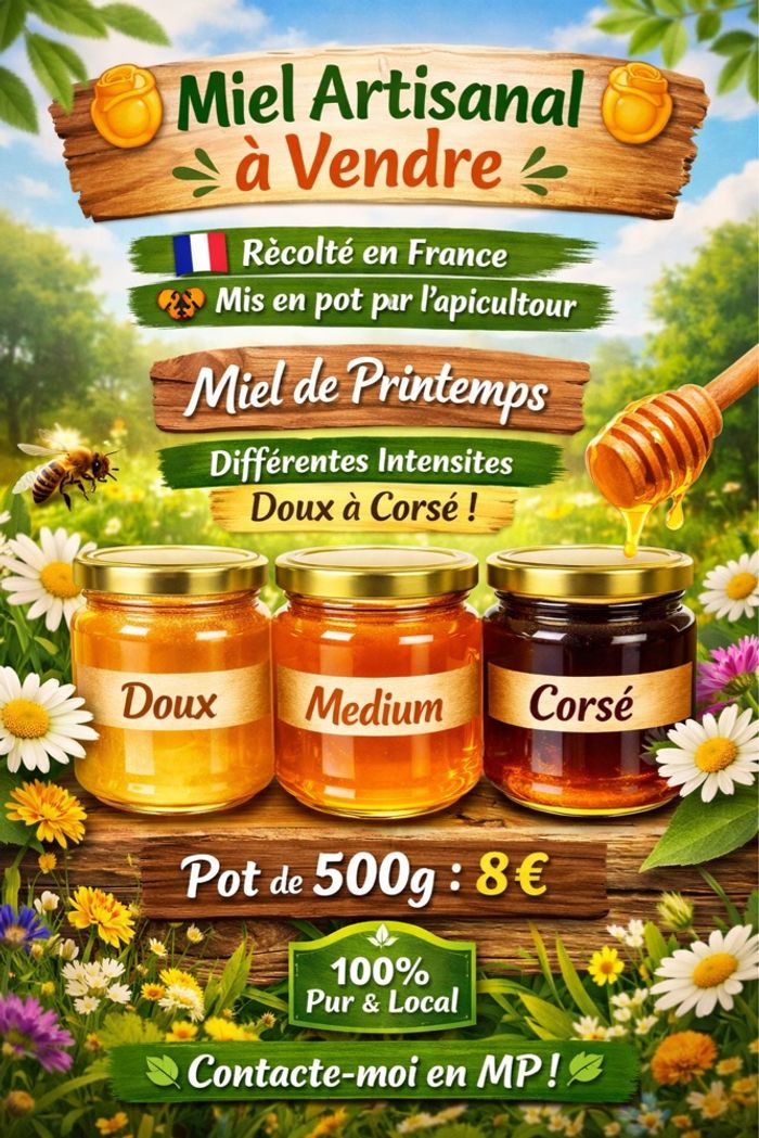 Vend du Miel, directement récolté et mis en pot par l’apiculteur. Le Miel est bio sans conservateur, ni arôme huit euros le pot, il y a plusieurs intensité, le blanc plus doux, qui tire sur le colza, le marron clair un peu plus corsé qui tire sur le tilleul et le marron foncé intense Miel des bois. Hésitez pas si vous avez des questions.