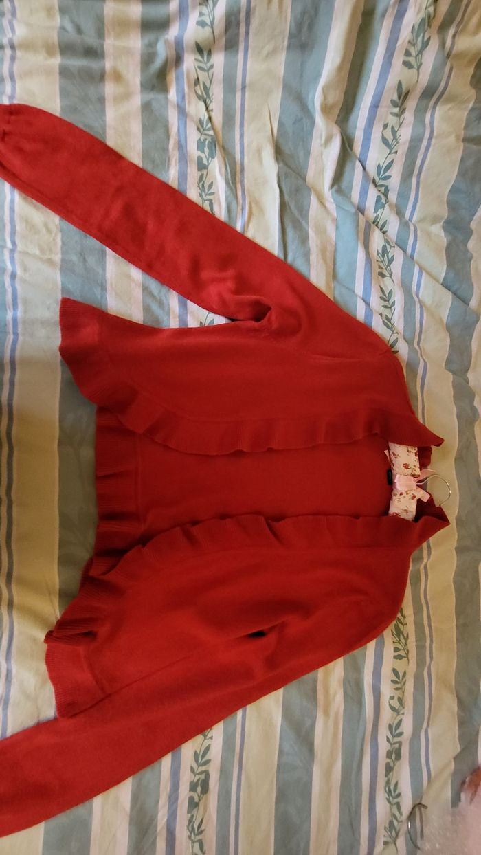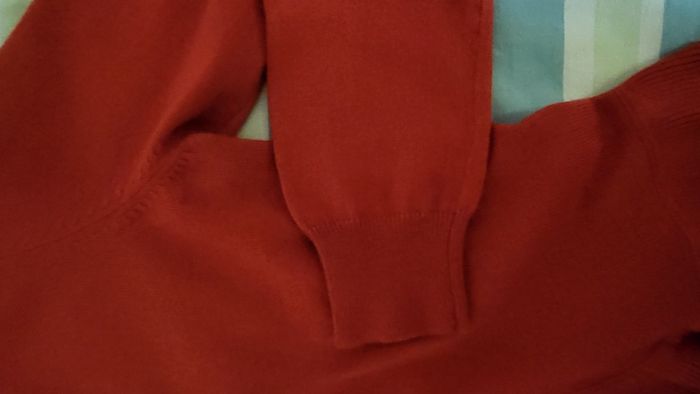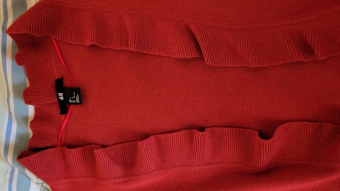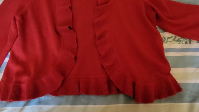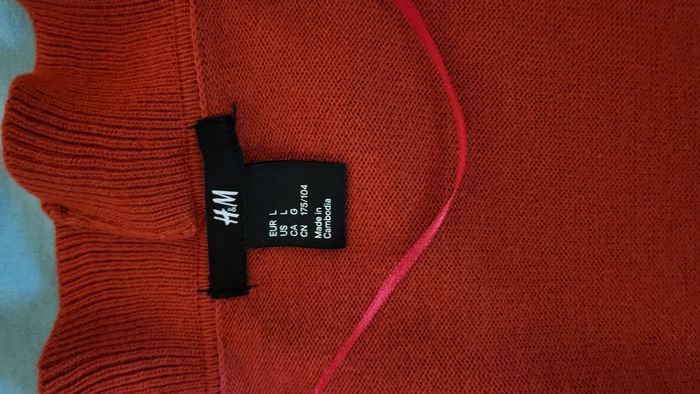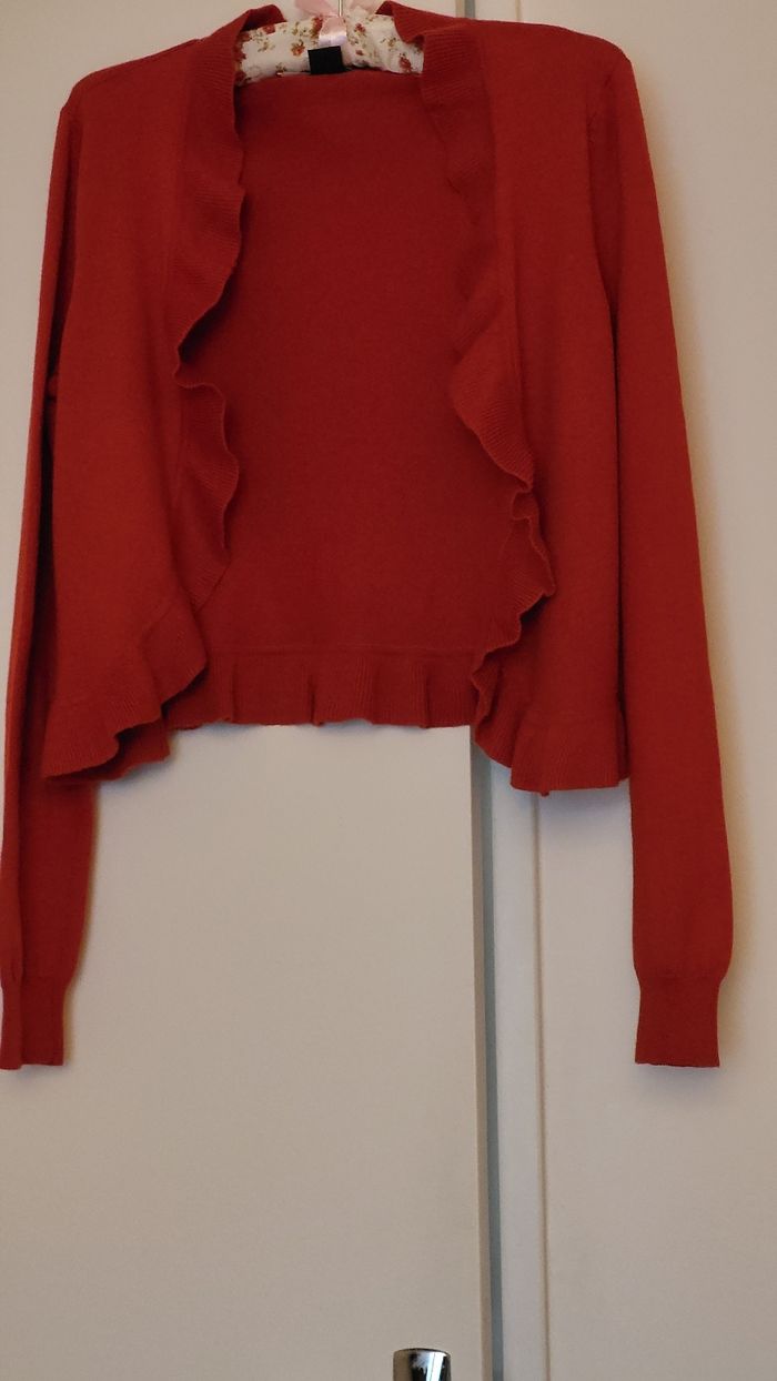 Beau Gilet boléro de chez H et M Indiqué t L mais correspond à un 40. Couleur orange brique. Matière douce, lavable en machine, Je l'ai lavé à 30 après l'avoir acheté mais je ne l'ai jamais porté. Hauteur 48 cm environ