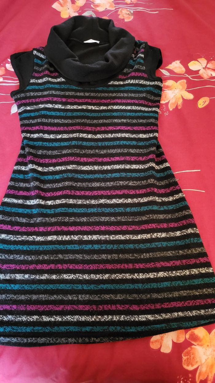 Robe Renatto bene en très bon état. Indiqué t3, correspond à un 38/40 100% acrylique Noir, bandes blanches, fushia,grises et vert bleu. Longueur 90 cm environ
