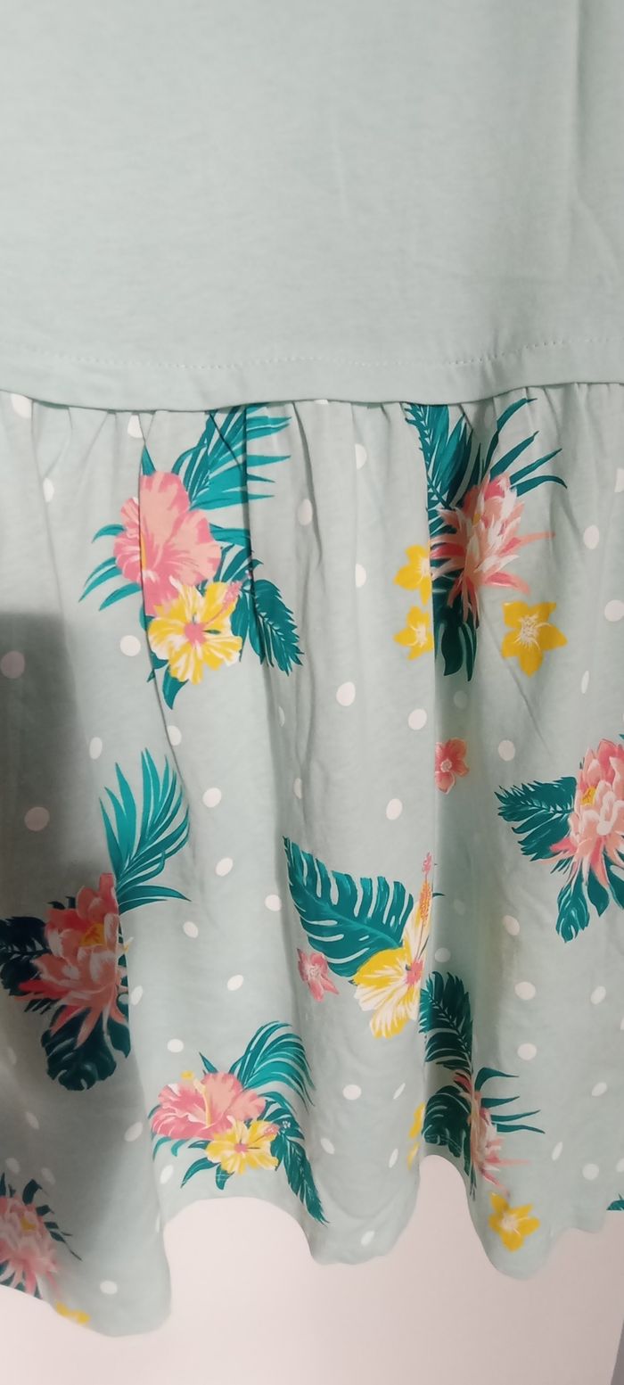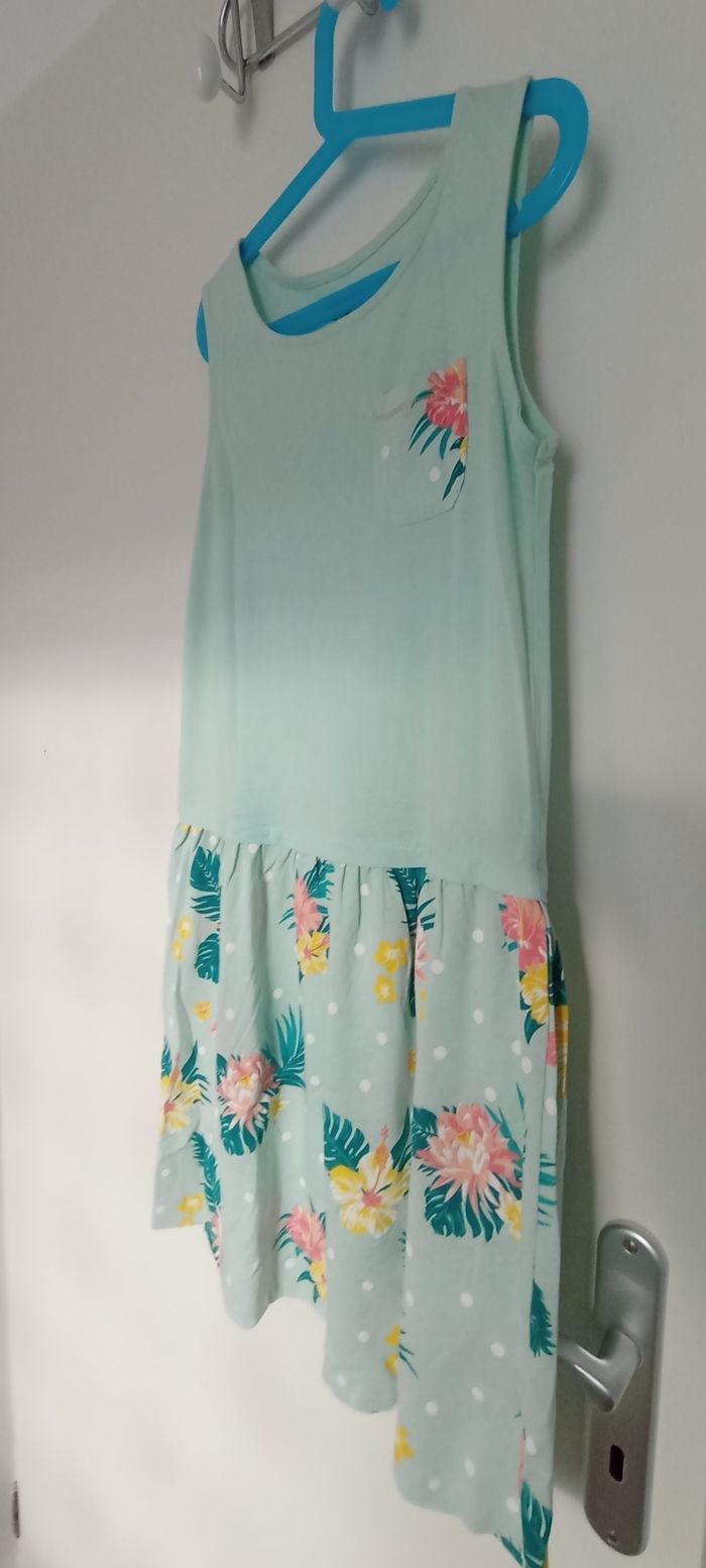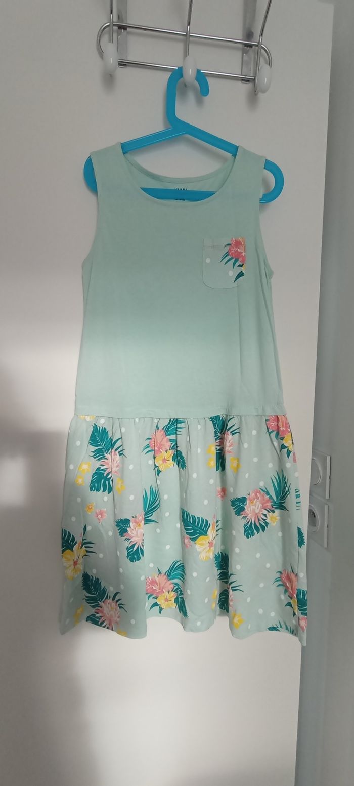Je vends une Très jolie robe d’été fille taille 12 ans de la marque Kiabi. Robe complète une pièce, sans manches. Haut vert menthe avec petite poche décorative fleurie. Bas évasé avec motifs tropicaux (fleurs roses et jaunes, feuilles vertes) et petits pois blancs. Légère et agréable à porter, parfaite pour le printemps et l’éte , neuf