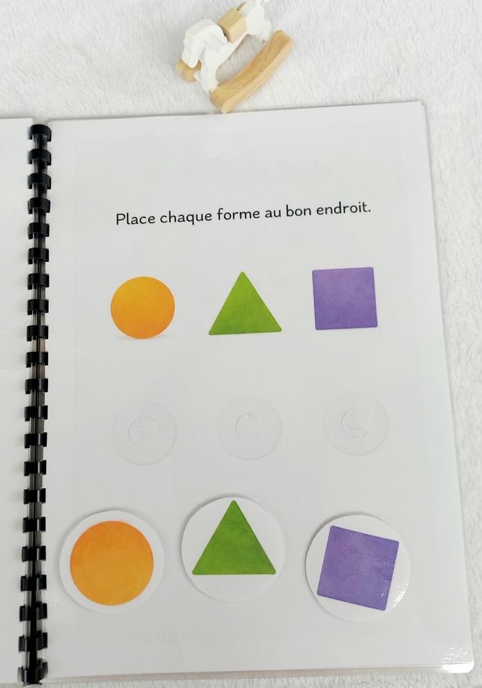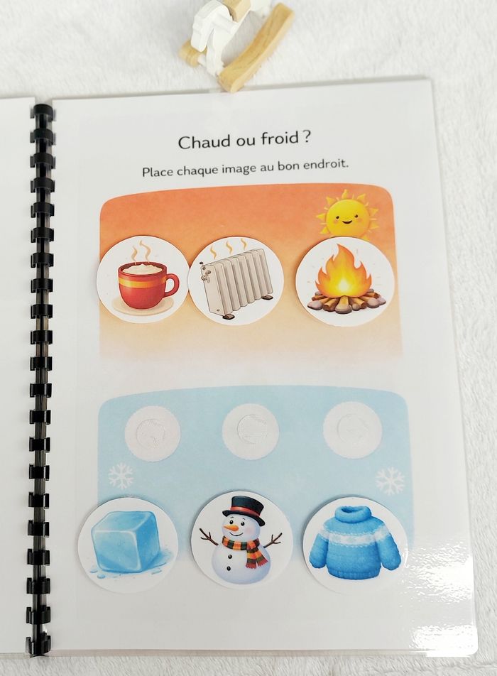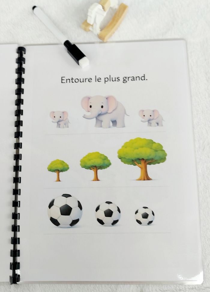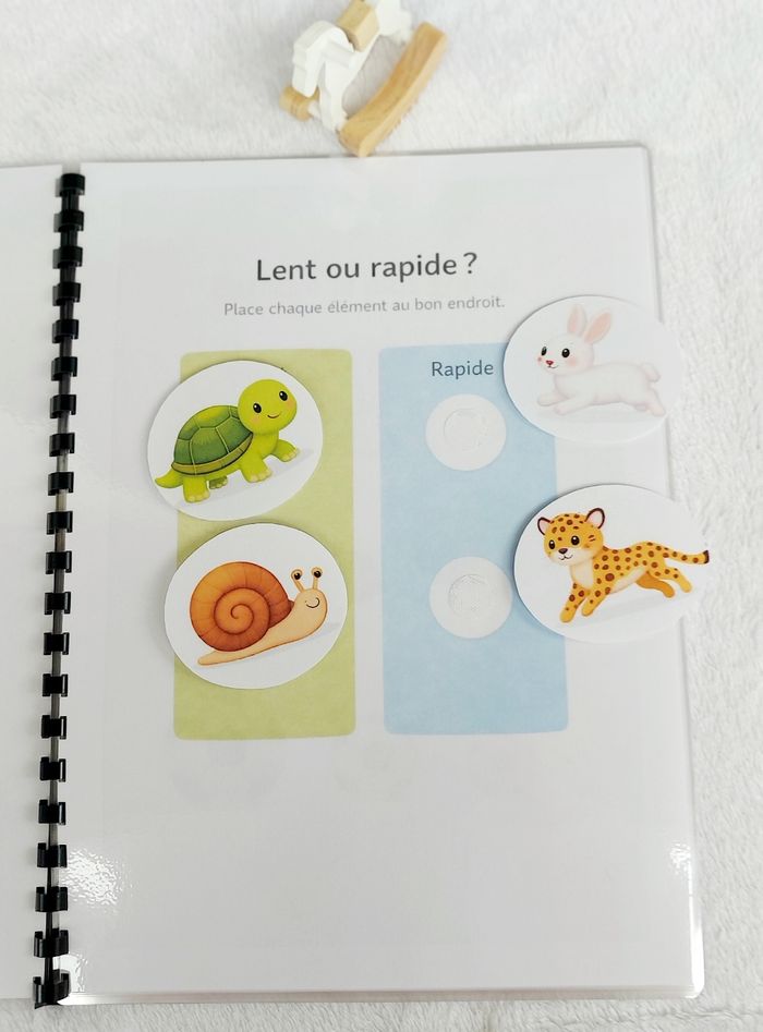 Grand livret d’activités éducatif dès 24 mois. 10 pages plastifiées et réutilisables avec éléments à placer (scratch). Activités incluses : • Entoure le plus grand • Chaud ou froid • Lent ou rapide • Haut ou bas • Qui mange quoi • Les saisons • Associer les formes • Tracer le chemin • Compléter le koala Idéal pour développer : ✔ la motricité fine ✔ la logique ✔ le vocabulaire ✔ l’autonomie Format A4 – plastifié – très bon état. Convient pour enfant de 24 à 36 mois.