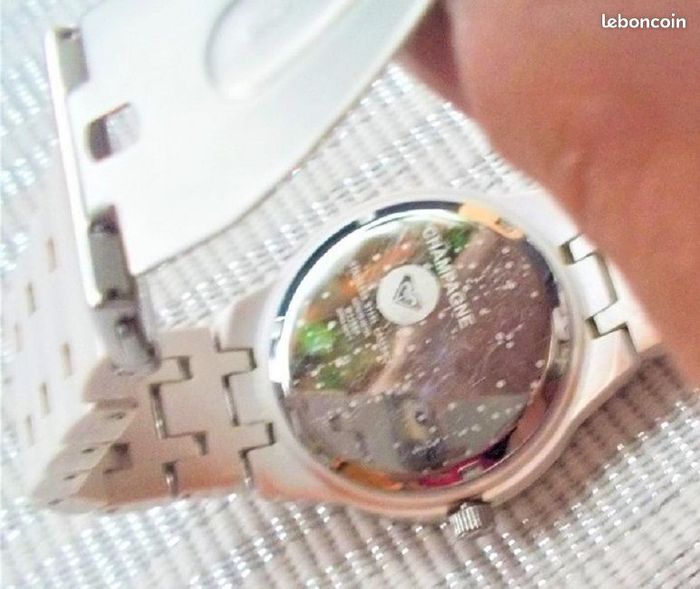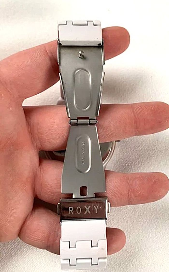 Montre ROXY "White Champagne", boitier blanc de 40 mm, contour serti des cristaux, intérieur blanc à traits et aiguilles argent, et bracelet blanc assorti, fonctionnante, pile fourni, prix définitif.