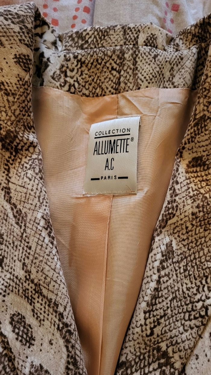 Jolie veste de la marque Allumette. Tons marrons et beige. Manches 3/4 Entièrementdoublée. Plus d'étiquette ms correspond à un 38/40 En excellent état, portée une fois. Je l'ai lavée en cycle délicat avt la mise en vente et elle n'a pas bougé.