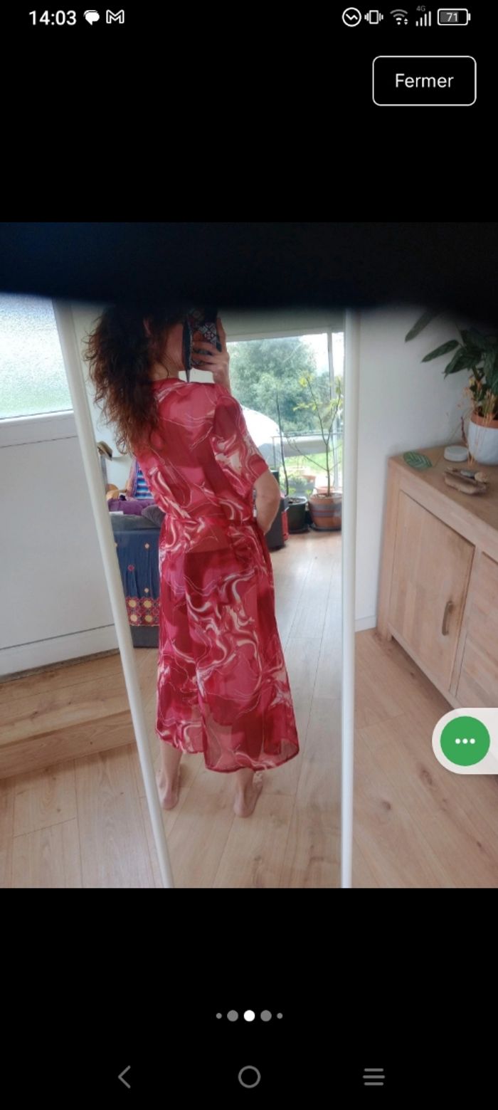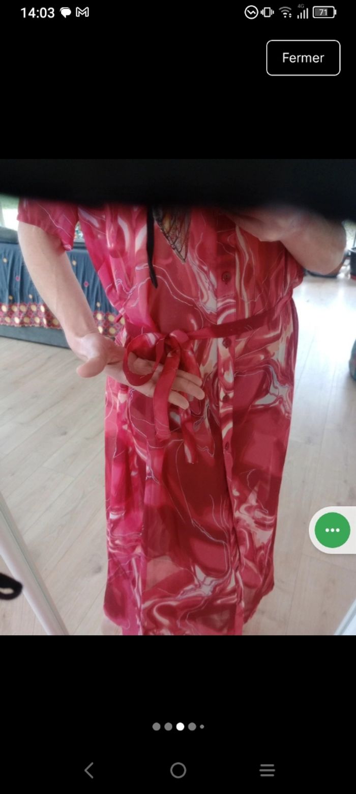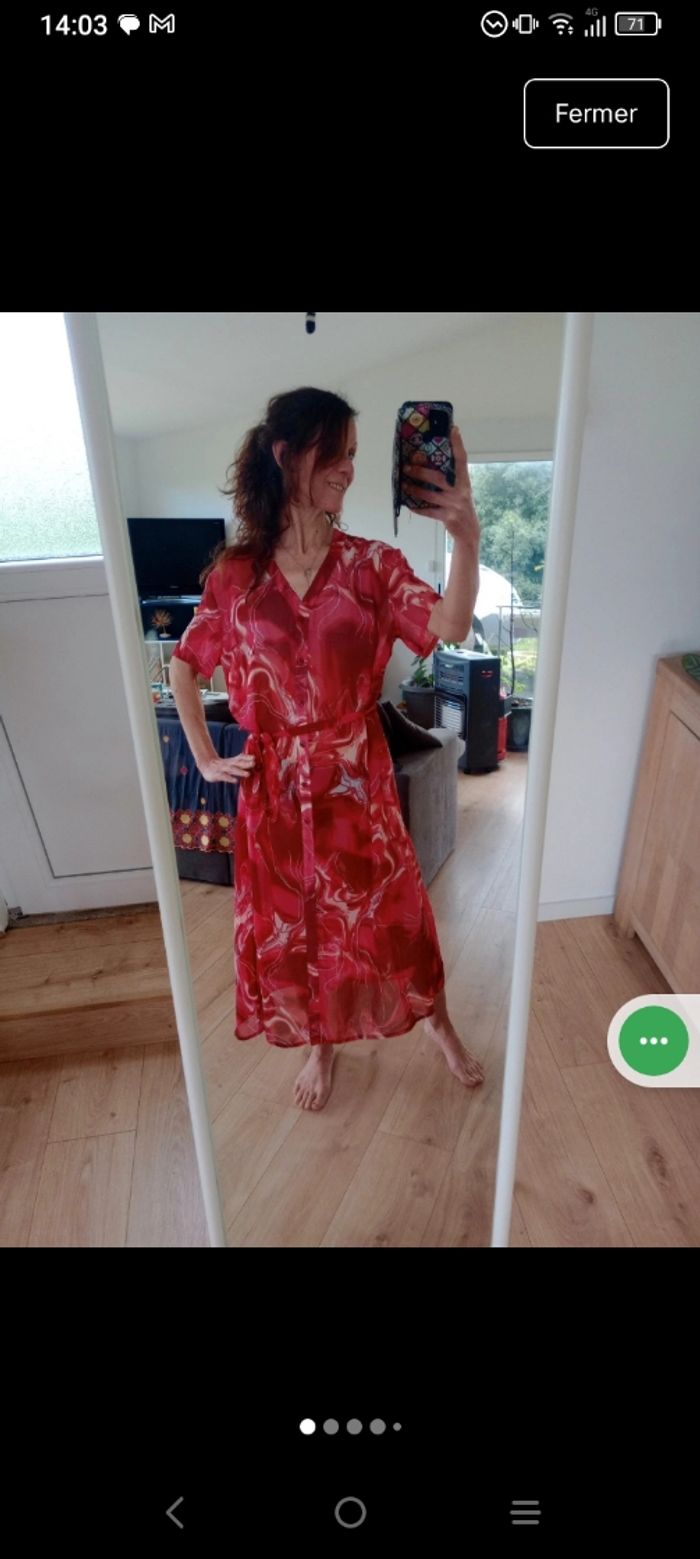 ​Neuve avec Étiquette 🥰 ​Magnifique robe longue (ou robe de plage esprit pareo)de la marque Triumph, totalement neuve avec son étiquette. Elle se distingue par son imprimé abstrait et fluide aux nuances de rouge, terracotta et crème. ​Détails de l'article : ​Coupe : Robe chemise longue, fluide et légèrement transparente. ​Détails : Boutonnage sur toute la longueur à l'avant et manches courtes. ​Taille : Lien de serrage assorti à la taille pour marquer la silhouette selon vos envies. ​Imprimé : Motif "marbré" ou "vagues" très moderne et dynamique. ​Style : Parfaite pour l'été, une sortie à la plage ou en mode homewear chic. ​ ​Taille indiquée : FR 48 / EU 46. ​Marque : Triumph. ​État : Neuf, jamais portée, avec étiquette d'origine. Pour info j'ai mis sur la dernière photo le prix d'une robe de plage de cette marque... Pour l'équivalence... Pas de négociation possible.. À ce prix-là c'est une affaire ☺️ #calomomi_femme48 ​#triumph #robelongue #pareo #robeete #rouge #neufavecetiquette #taille48 #boho #homewear #beachwear #imprimemarbre