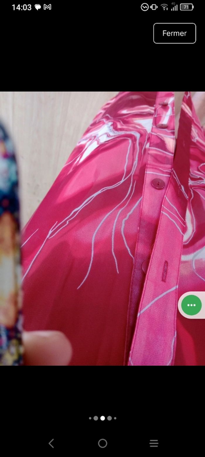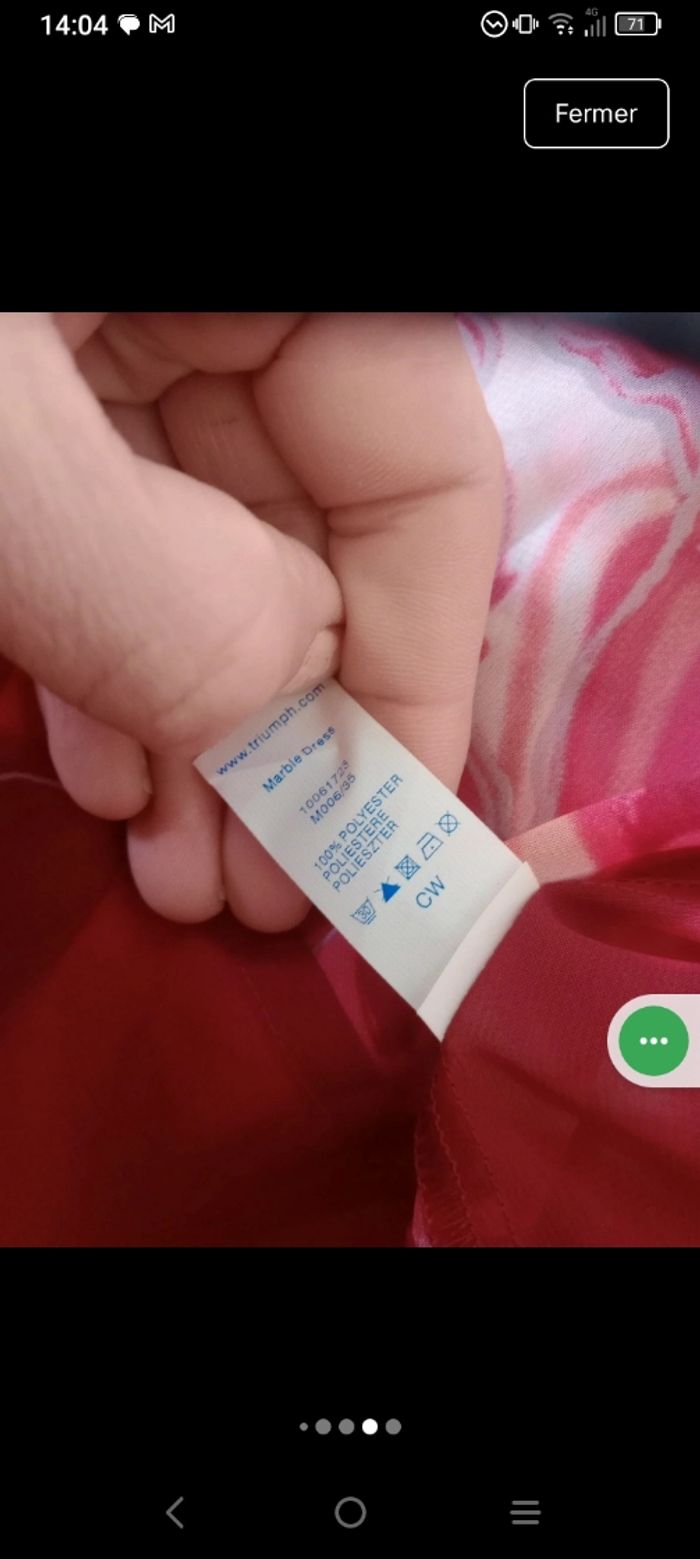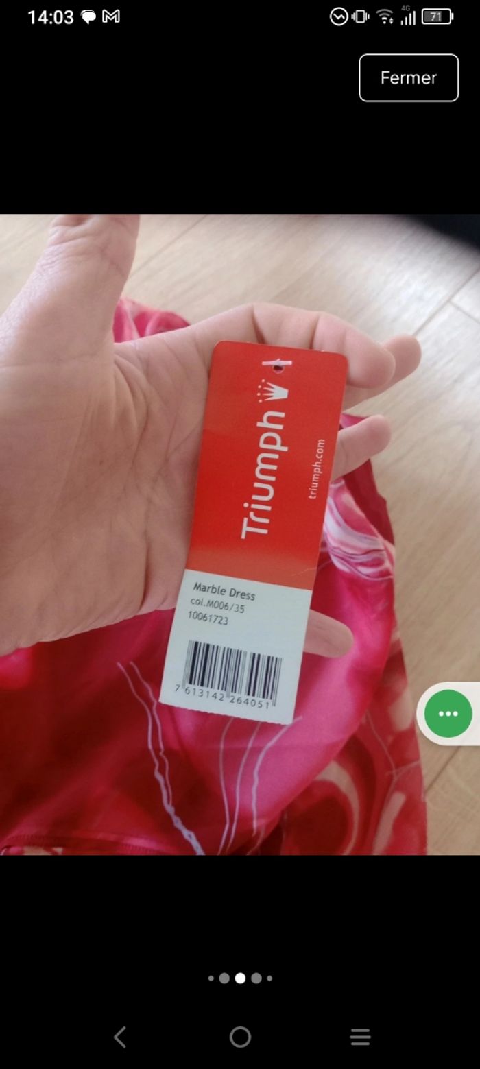 ​Neuve avec Étiquette 🥰 ​Magnifique robe longue (ou robe de plage esprit pareo)de la marque Triumph, totalement neuve avec son étiquette. Elle se distingue par son imprimé abstrait et fluide aux nuances de rouge, terracotta et crème. ​Détails de l'article : ​Coupe : Robe chemise longue, fluide et légèrement transparente. ​Détails : Boutonnage sur toute la longueur à l'avant et manches courtes. ​Taille : Lien de serrage assorti à la taille pour marquer la silhouette selon vos envies. ​Imprimé : Motif "marbré" ou "vagues" très moderne et dynamique. ​Style : Parfaite pour l'été, une sortie à la plage ou en mode homewear chic. ​ ​Taille indiquée : FR 48 / EU 46. ​Marque : Triumph. ​État : Neuf, jamais portée, avec étiquette d'origine. Pour info j'ai mis sur la dernière photo le prix d'une robe de plage de cette marque... Pour l'équivalence... Pas de négociation possible.. À ce prix-là c'est une affaire ☺️ #calomomi_femme48 ​#triumph #robelongue #pareo #robeete #rouge #neufavecetiquette #taille48 #boho #homewear #beachwear #imprimemarbre