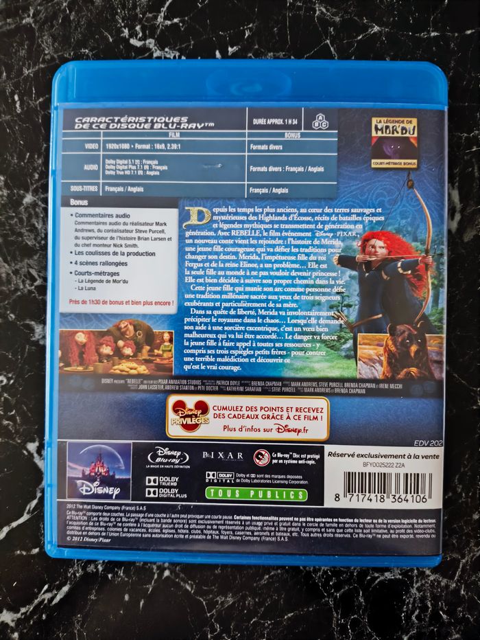 Film Rebelle (2012 - Brave) en très bon état. Edition numéroté 104. Animation, Aventure et Fantastique de Mark Andrews avec les voix de Kelly Macdonald, Billy Connolly, Emma Thompson, Julie Walters et Robbie Coltrane. Plusieurs autres films (DVD et blu-ray) et séries télé disponibles sur mon dressing. Si vous avez des questions ou souhaitez plus de photos, n'hésitez pas à me demander. Prix négociable seulement si vous achetez plusieurs articles. N'hésitez pas à créer un lot et à faire une proposition raisonnable et à me demander un prix. Tag de recherche : #neboo_video #neboo_bluray #neboo_film blu ray bluray langue français française French FR Disney