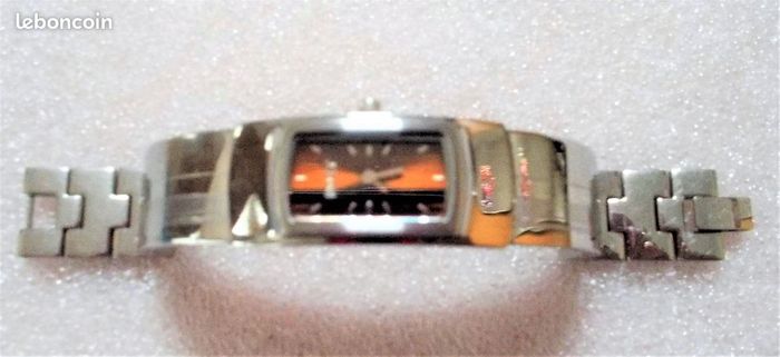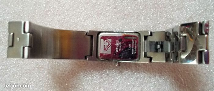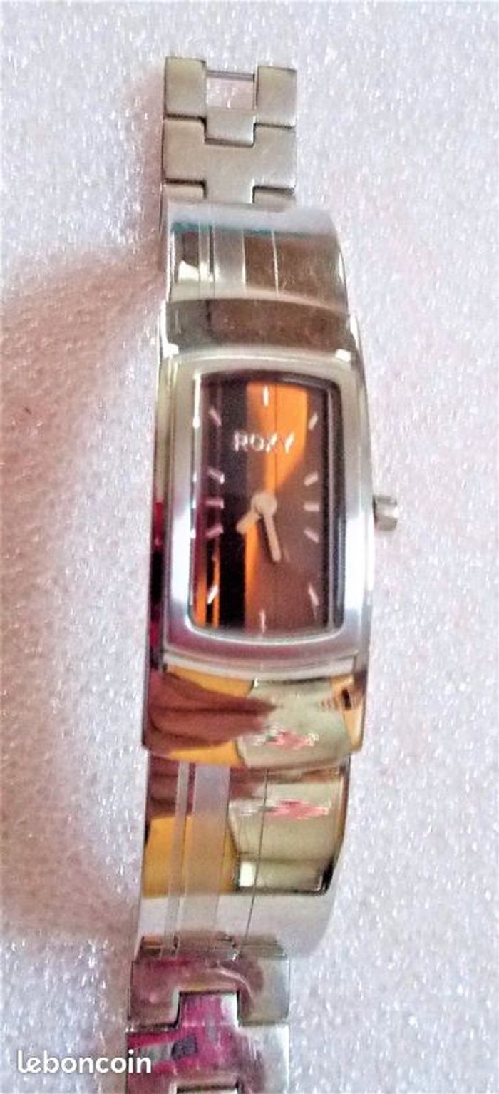 Montre ROXY "Wanted", boitier de forme rectangulaire en acier argenté, à intérieur marron et aiguilles argent, et bracelet acier argenté assorti, tbé, fonctionnante, pile fourni, prix définitif.