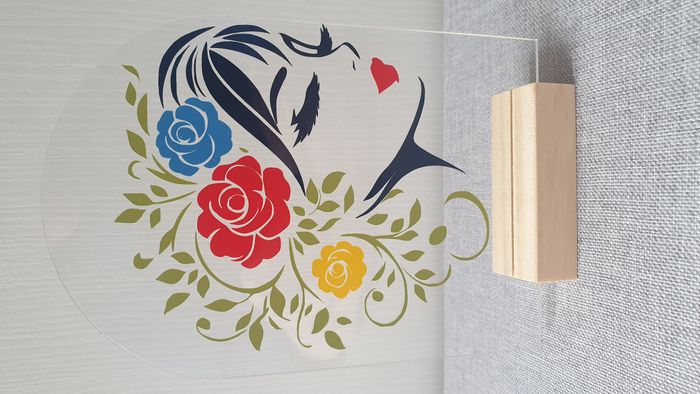 Stand Acrylique avec support en bois, personnalisé avec du vinyle permanent grâce à la Cricut Joy. Dimension : 15cm x 10cm