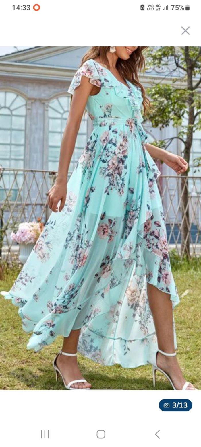 longue robe mousseline asymétrique doublée à imprimé floral et col en V, avec détail froncé, manches courtes et ceinture cintrante - Parfaite pour les mariages et les événements formels, grande taille Voir les mesures Il n’y a plus la taille mais va pour une taille 50/52 voir les mesures Portée très peu pour une occasion