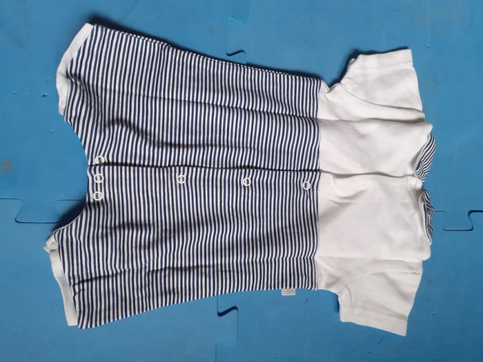Vends lot de 2 barboteuses, garçon, 3mois. Celui avec des baleines est de marque Tex, celui rayé n'a pas de marque