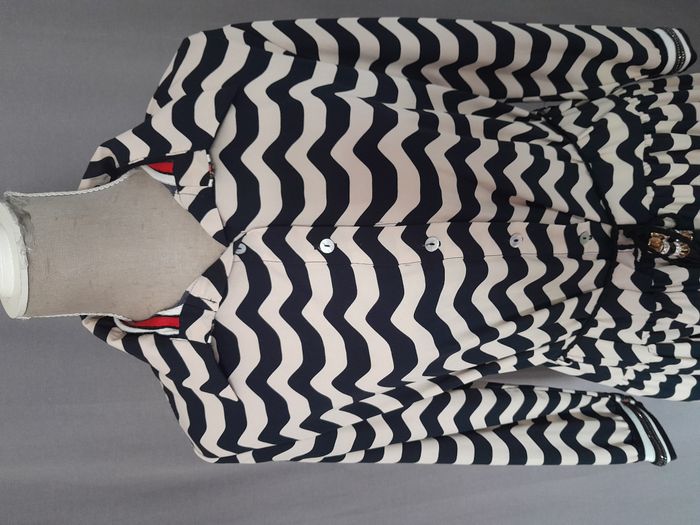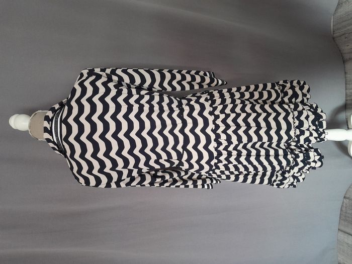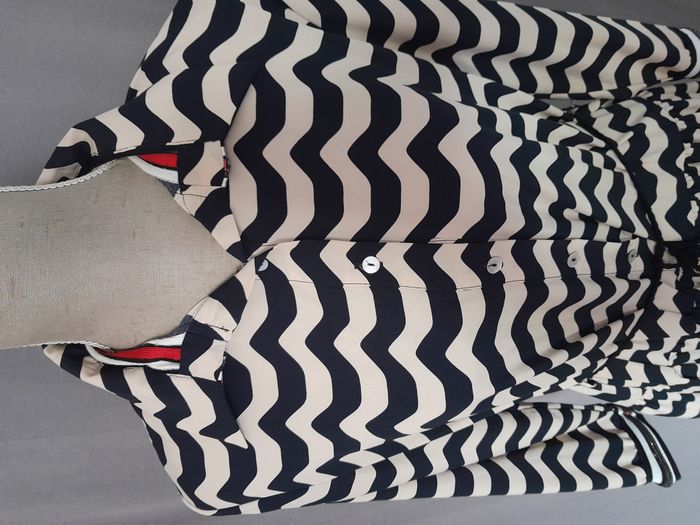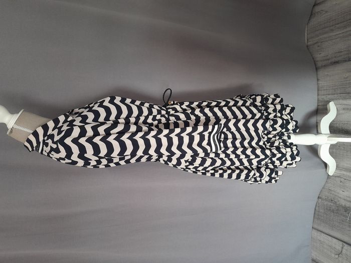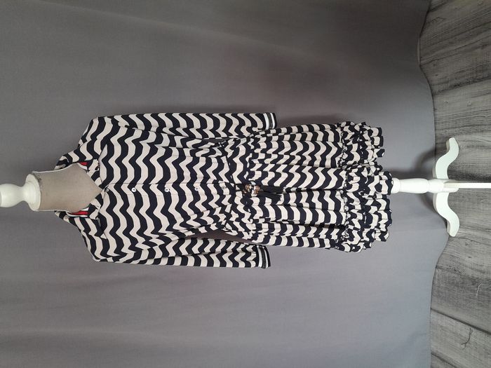 Robe chic, à rayure, col chemise avec strass, manche longue avec strass sur le bas des manche, 3 volant sur le bas, attache bouton + cordon avec perle en déco Longueur : 94cm Aiss / Aiss : 49cm Matière : 100 % Polyester Marque : Monaco