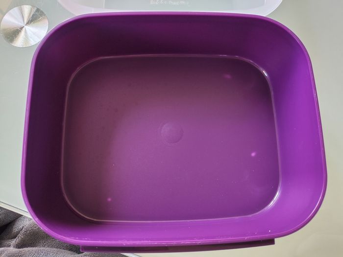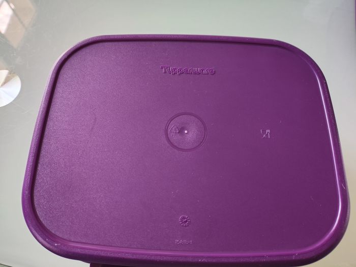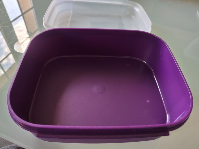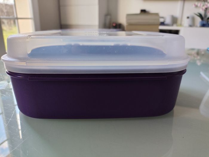Boîte de conservation Tupperware originale, idéale pour le réfrigérateur, le transport de repas ou le rangement alimentaire. Plastique solide et de qualité, couvercle bien ajusté. • Couleur : violet + couvercle blanc • Forme : rectangulaire • État : très bon état (propres, quelques micro-traces normales d’usage) • Marque : Tupperware Maison non-fumeur. Remise possible pour achat en lot, n’hésitez pas à regarder mon dressing. Hauteur 8cm Largeur 18cm Largeur 20cm