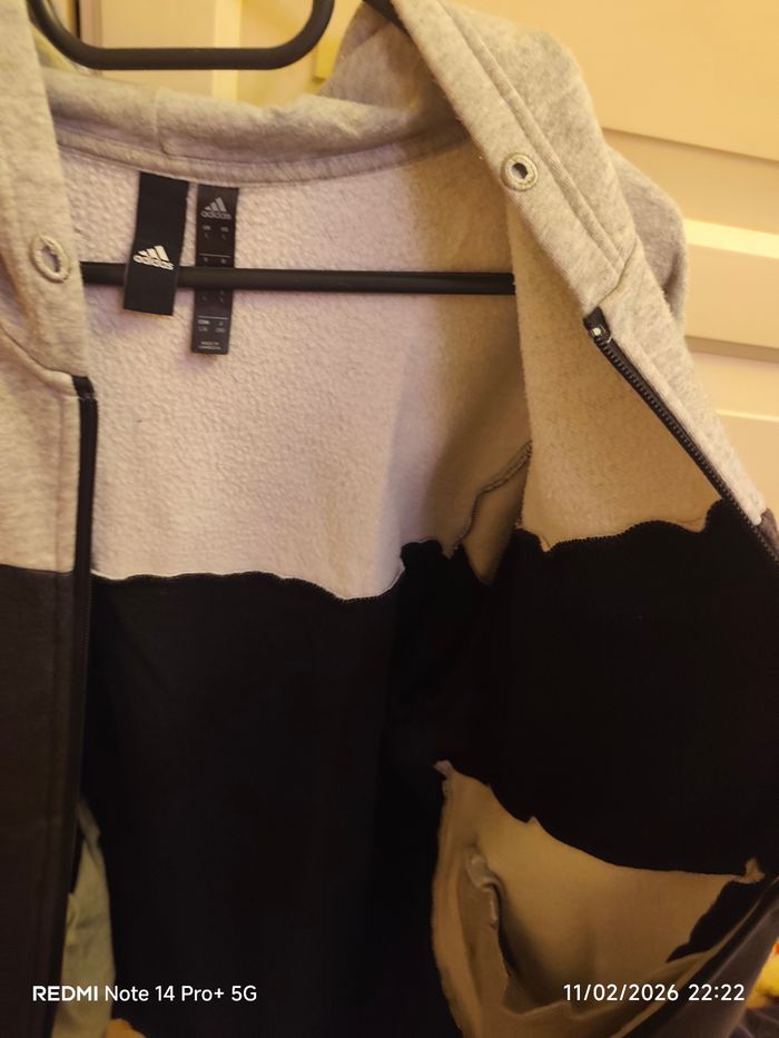 Veste polaire Adidas Homme – Taille L Noir et gris, très bon état ✅ Chaleur et confort, parfaite pour l’extérieur ou le quotidien. Logo discret, fermeture zippée et poches pratiques.