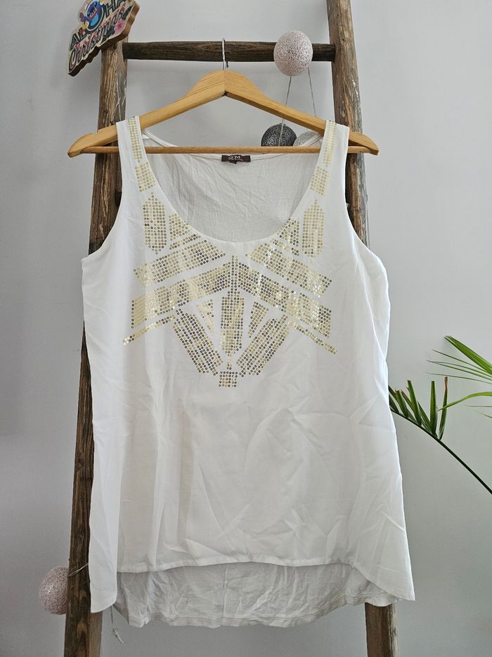 Débardeur GDM grain de malice Taille 38 M Doublé Devant avec paillettes dorées Blanc cassé