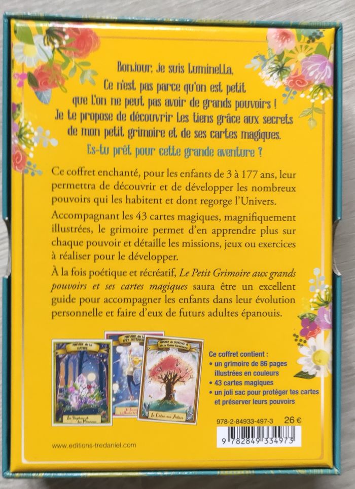 oracle pour enfant état neuf, utilisé une fois. Je vend d'autres oracle pour enfant, n'hésitez pas à regarder mes autres annonces Avec 43 cartes Ce coffret composé d'un livre et de 44 cartes magiques, est un outil ludique proposé aux enfants de 3 à 177 ans afin de leur permettre de découvrir et de développer les pouvoirs qui les habitent et dont regorge l'Univers. Au total, 14 pouvoirs sont évoqués comme celui des émotions, de la paix intérieure, de la confiance en soi, du sommeil, de l'alimentation, de la nature? Ces pouvoirs permettent aux enfants d'utiliser et de mettre en lumière les ressources de leur monde intérieur tout en apprenant à faire avec celles du monde extérieur. Ainsi, ils peuvent appréhender avec plus de facilité les évènements et les épreuves du quotidien rencontrés à l'école ou à la maison. L'enfant pioche une carte magique. Il découvre ainsi le pouvoir qui lui est proposé de développer. Il est ensuite invité à réaliser l'exercice joyeux ou la mission divertissante indiqué(e) sur la carte. Le livre servant de support, l'enfant pourra s'y référer afin d'en apprendre davantage sur le pouvoir et l'exercice dont il est question.