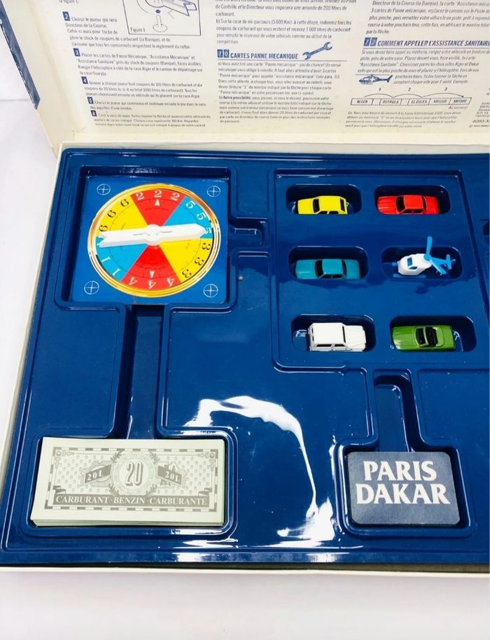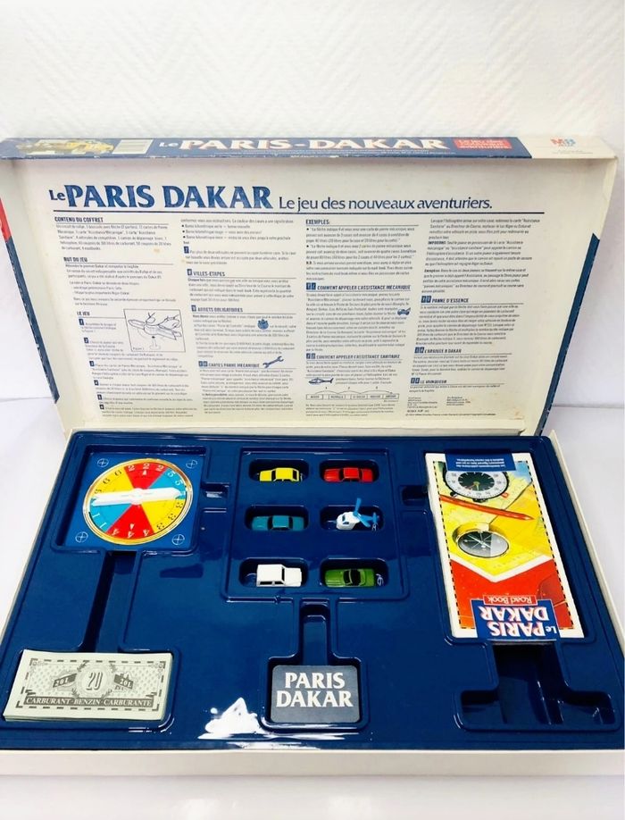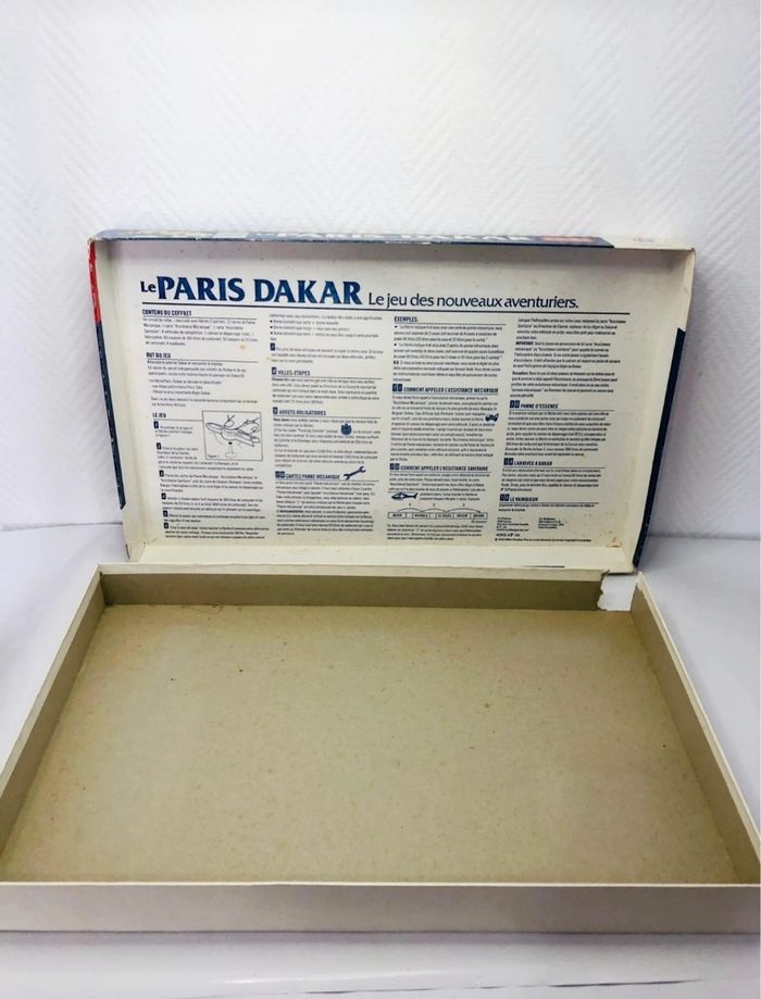 Jeu de société Le Paris-Dakar, un jeu d'aventure et de rallye. - Type de produit : Jeu de société - Âge recommandé : 8 ans et + - Marque : MB En bon état, il manque une hélice à l’hélicoptère Boite abîmée Complet Un jeu idéal pour les passionnés de rallye !