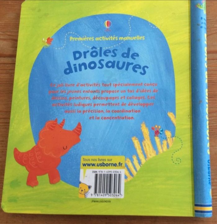 Je vends ce livre d'activités sur les dinosaures, idéal pour les enfants. Ce cahier à spirale regroupe une douzaine de projets pour s'exercer à la réalisation d'autant de dinosaures en recourant principalement au découpage et au collage de carton et de papier que l'on rehausse de peinture ou de crayon-feutre. Chaque création est expliquée étape par étape et accessible via un onglet à l'effigie de la créature en vedette. - Titre : Drôles de dinosaures - Genre : Livre pour enfant - Éditeur : Usborne - Année d'édition : 2022 - Format : Broché, Livre cartonné Très bon état N'hésitez pas à me contacter pour plus d'informations !