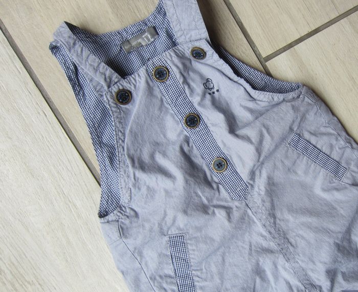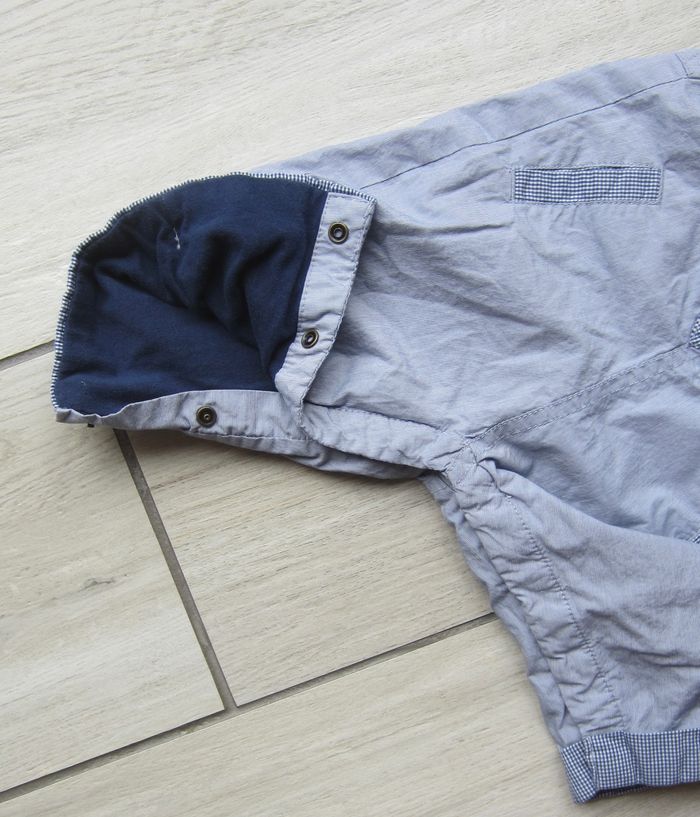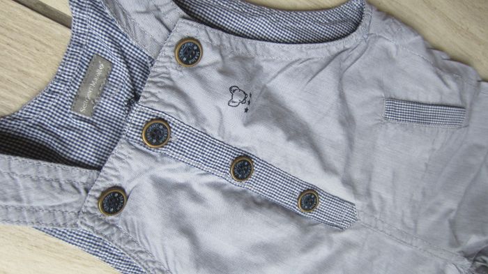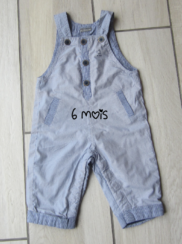 Salopette de coloris bleu. Double emplacement aux bretelles. S'ouvre entierement a l'entrejambe. Taille 6 mois. Marque Sergent Major.