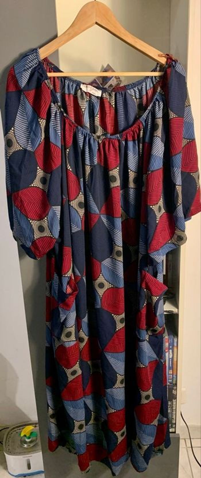 Robe bleu/rouge aux motifs fleurs. Taille 2XL sur l’étiquette. Matière polyester. Marque Edmond Boublil