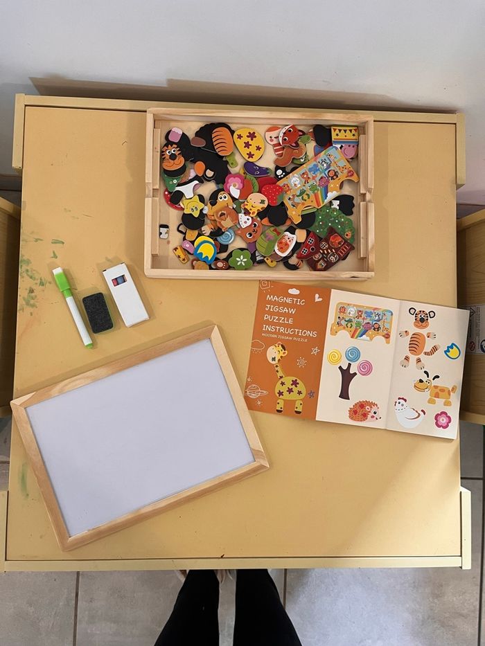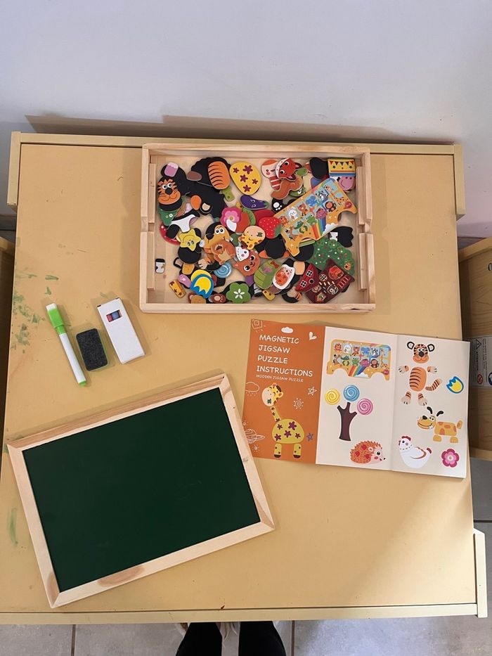 Boîte ardoise (un côté craies, un côté feutre) Fourni avec 4 craies, un feutre et une brosse Ainsi que des magnets et des modèles à reproduire