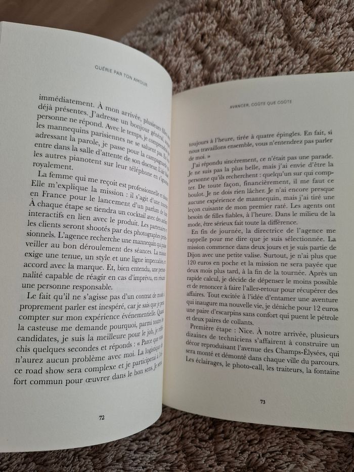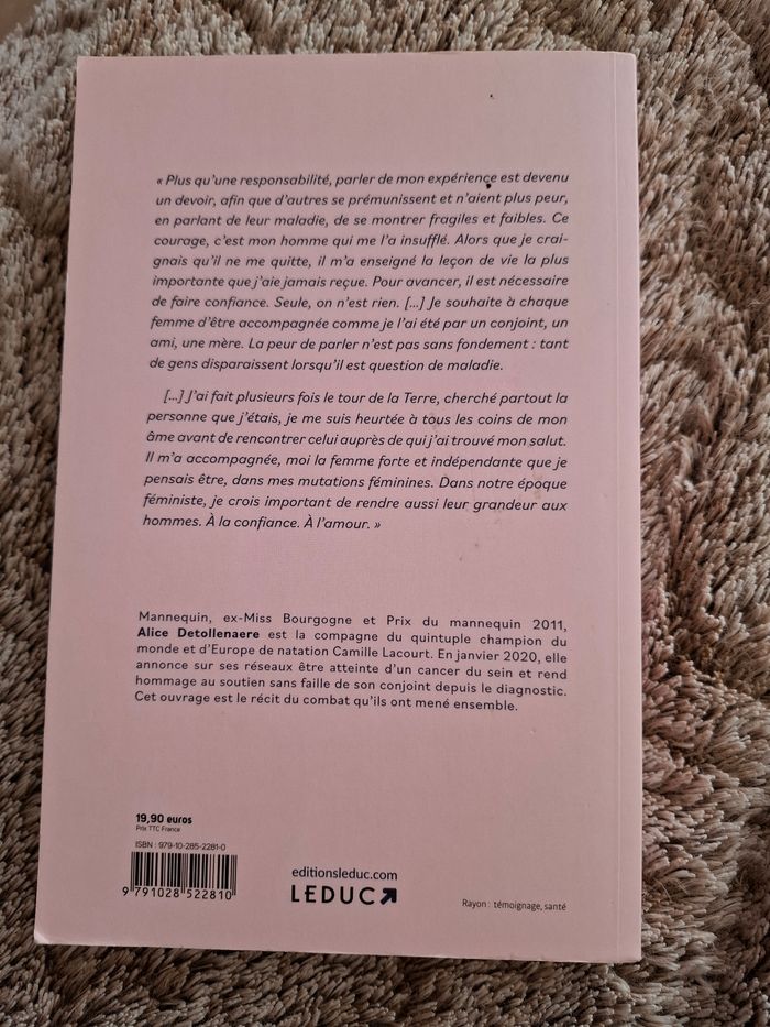Témoignage Guérie par ton amour de Alice Detollenaere en très bon état Éditions Leduc "Plus qu’une responsabilité, parler de mon expérience est devenu un devoir, afin que d’autres se prémunissent et n’aient plus peur, en parlant de leur maladie, de se montrer fragiles et faibles. Ce courage, c’est mon homme qui me l’a insufflé. Alors que je craignais qu’il ne me quitte, il m’a enseigné la leçon de vie la plus importante que j’aie jamais reçue. Pour avancer, il est nécessaire de faire confiance. Seule, on n’est rien. Je souhaite à chaque femme d’être accompagnée comme je l’ai été par un conjoint, un ami, une mère. La peur de parler n’est pas sans fondement : tant de gens disparaissent lorsqu’il est question de maladie. J’ai fait plusieurs fois le tour de la Terre, cherché partout la personne que j’étais, je me suis heurtée à tous les coins de mon âme avant de rencontrer celui auprès de qui j’ai trouvé mon salut. Il m’a accompagnée, moi la femme forte et indépendante que je pensais être, dans mes mutations féminines. Dans notre époque féministe, je crois important de rendre aussi leur grandeur aux hommes. À la confiance. À l’amour." Ce récit est une belle leçon de vie, de résilience, lourd en émotions.. Prix d'achat 19.90 euros