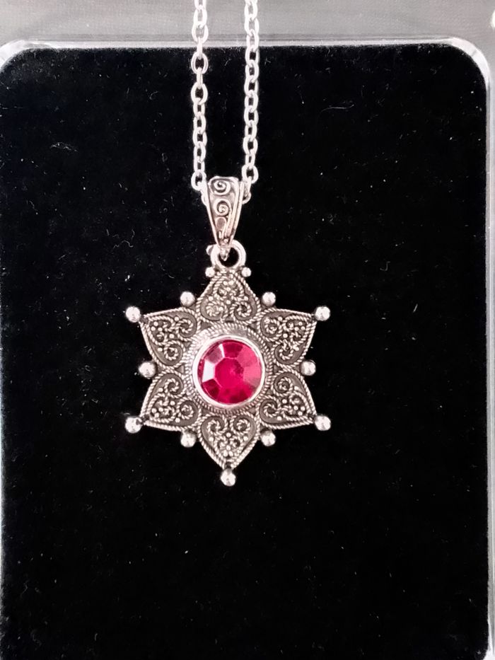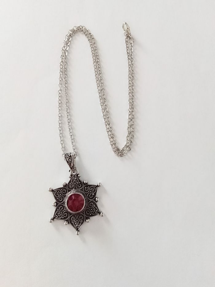 Chaîne + pendentif bohème. Pendentif : hexagramme. (bohème, spirituel, celtique, élégant, idéal cadeau) DESCRIPTIF : Couleur : argenté, rouge. Taille chaîne : 50 cm Diamètre pendentif : 2,8 cm L * 3,3 cm H Envoi rapide et soigné.